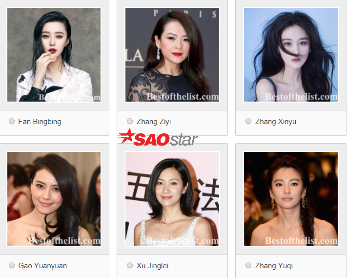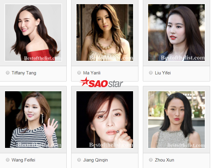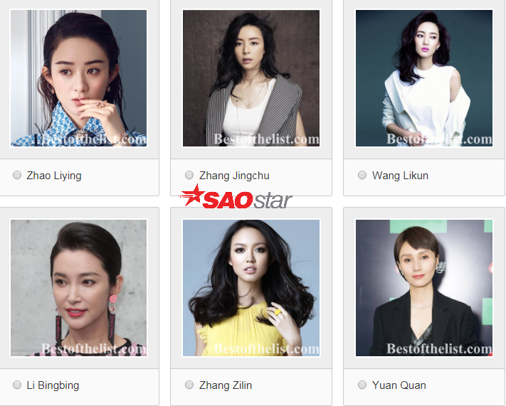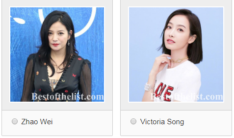 Trang Bestofthelist đã chọn ra 20 nữ diễn viên hàng đầu ngành công nghiệp giải trí Hoa ngữ để tiến hành cuộc bầu chọn cho hạng mục Nữ diễn viên Trung Quốc đẹp nhất năm 2018. Kết quả của bảng xếp hạng phụ thuộc vào phiếu bầu của người hâm mộ địa phương và quốc tế. Thể lệ bầu chọn: 1 phiếu trong một ngày, tức 24 giờ. Dự kiến ngày kết thúc cuộc thi sẽ vào ngày 20/04 năm sau.