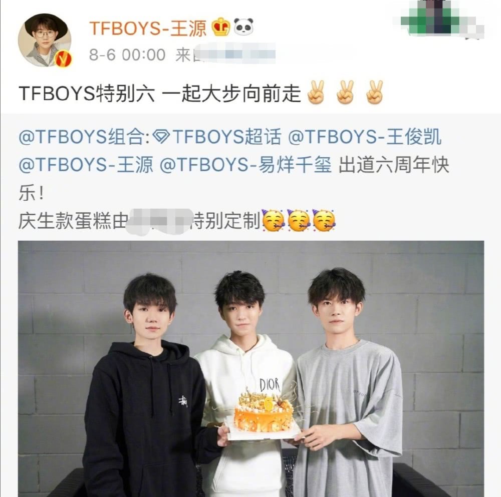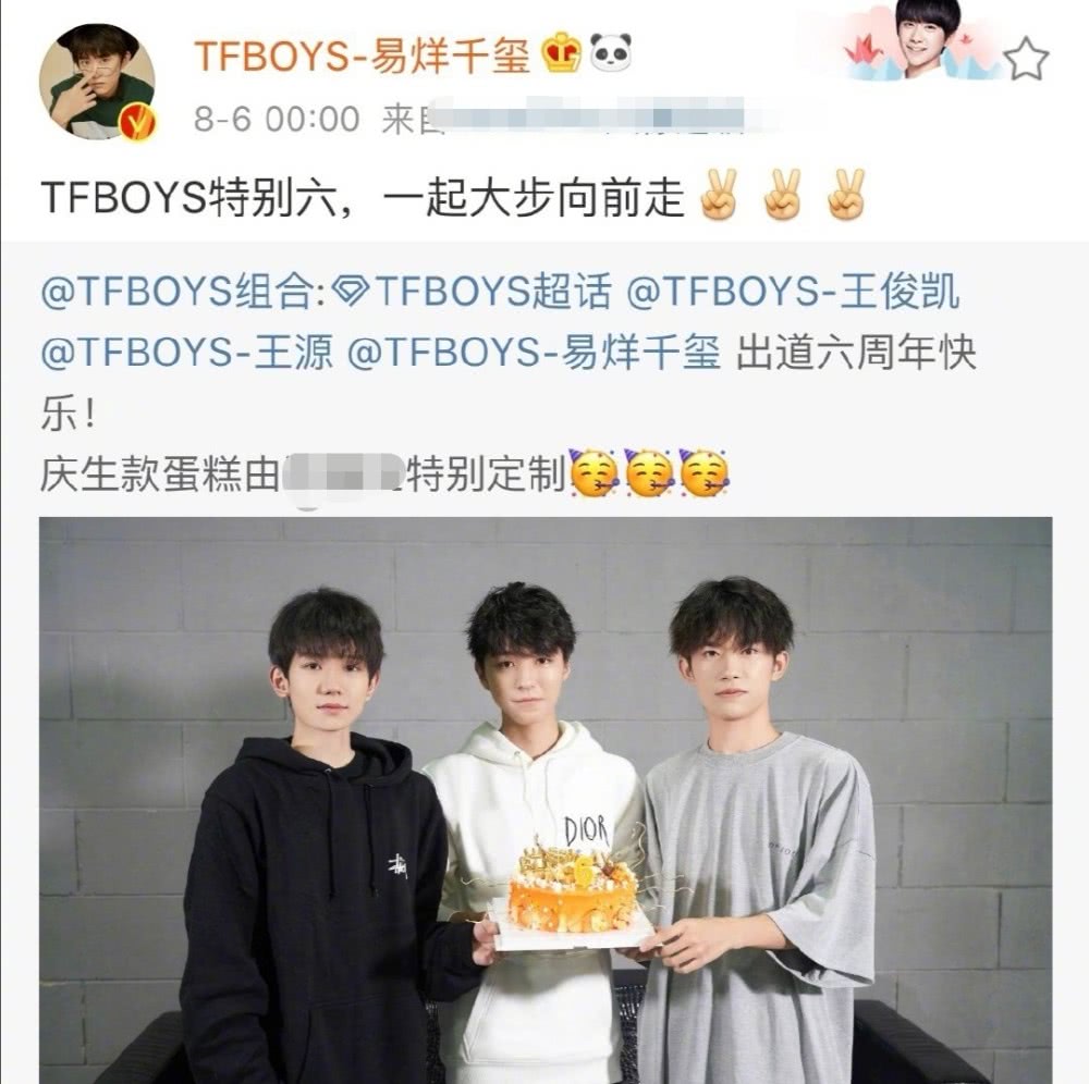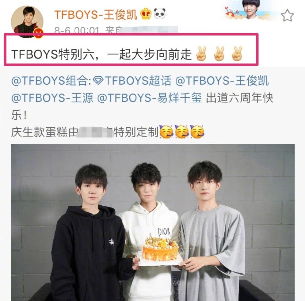 Ngày 6 tháng 8, vừa đúng là ngày kỷ niệm 6 năm ra mắt (debut) của TFBoys , weibo chính thức của nhóm cũng đã đăng bài chúc mừng. Đồng thời, họ cũng kèm theo hình ảnh chụp chung của Vương Tuấn Khải, Vương Nguyên và Dịch Dương Thiên Tỉ. Ba người họ cùng nhau cằm bánh kem, nhan sắc tài năng đều có, hơn nữa đều tràn đầy sức sống và thanh xuân. Bức tranh ấm ấp này đã khơi dậy rất nhiều hồi ức của fan hâm mộ, rất nhiều khán giả trẻ tuổi đều nghe qua nhạc của họ, bây giờ vẫn tiếp tục để lại bình luận chúc mừng.