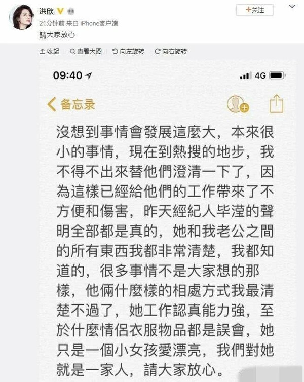 Bên cạnh đó thì sáng ngày 9 tháng 4, cư dân mạng lại phát hiện Hồng Hân xóa hết những nội dung bài viết trên weibo cá nhân liên quan đến Trương Đan Phong, thậm chí cả bài thanh minh trước đây ủng hộ Trương Đan Phong cũng đã bị số đi chỉ để lại một tấm ảnh chụp chung cùng Trương Đan Phong và Tất Oánh.