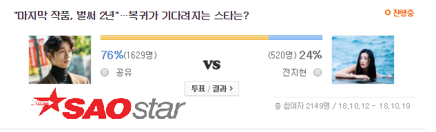 Câu hỏi thứ hai bắt đầu từ ngày 12/10 đến ngày 19/10: “Đã 2 năm kể từ drama cuối…Bạn mong chờ sự trở lại của ngôi sao nào?”. Đến hiện tại, Gong Yoo dành được số phiếu cao ngất ngưỡng với 1629 người bình chọn, đạt 76%. Theo đó, “mợ chảnh” Jeon Ji Hyun chỉ nhận 24% và 520 lượt bình chọn.
