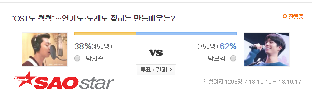 Tiếp đến là lựa chọn: “Trình diễn nhạc phim…diễn viên nào vừa đóng tốt vừa hát hay?”. Cuộc bình chọn diễn ra từ 10/10 đến 17/10. Kết quả hiện tại, Park Bo Gum nhận được nhiều lượt bình chọn hơn với 62%, 753 phiếu bầu. Trong khi, Park Seo Joon mang về 452 phiếu bầu và chiếm 38%.