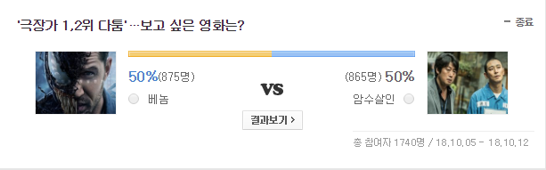 Mới đây, trang báo Nate của Hàn Quốc thường xuyên tiến hành cuộc bỏ phiếu với nhiều hạng mục khác nhau liên quan đến lĩnh vực phim ảnh, thậm chí âm nhạc và giải trí. Được biết cuộc bình chọn được tiến hành công khai trực tiếp trên mạng xã hội. Theo đó, người tham gia phải điền rõ thông tin cá nhân mới có thể bình chọn cho diễn viên, bộ phim yêu thích của mình. Dưới đây là tình hình, kết quả bỏ phiếu ngày hôm qua (15/10).