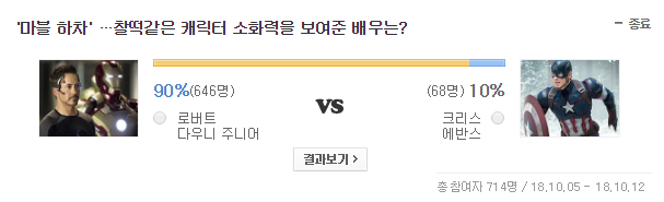 Trong câu hỏi kế tiếp: “Siêu anh hùng của Marvel..diễn viên nào thể hiện được năng lực hấp dẫn?”, được tiến hành từ ngày 05/10 đến 12/10. Kết quả là Robert Downey Jr. toàn thắng với 90% và 646 phiếu bầu, trong khi Chris Evans chỉ nhận 68 lượt bình chọn và chiếm 10%.