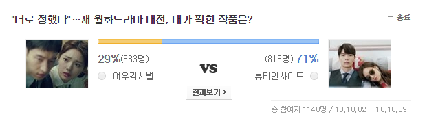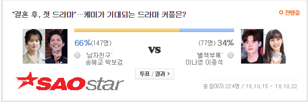 Đầu tiên, với câu hỏi: “Bộ phim đầu sau khi kết hôn….Bạn trông đợi vào tác phẩm truyền hình nào?” được tiến hành bầu chọn từ ngày 10/10 đến ngày 17/10. Hiện tại dự án mới Boyfriend của Song Hye Kyo và Park Bo Gum đang dẫn trước với 66% và 147 người bình chọn. Trong khi, tác phẩm Romance Supplement của Lee Jong Suk và Lee Na Young chiếm 34% với 77 phiếu.