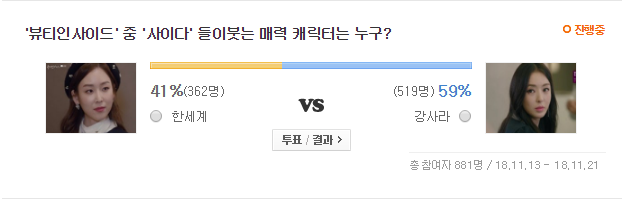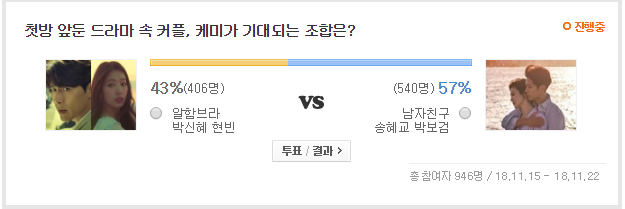 Đầu tiên, với câu hỏi: “Bạn mong đợi vào sự tương tác giữa cặp đôi nào trong bộ phim truyền hình sắp tới?” được tiến hành bầu chọn từ ngày 15/11 đến ngày 22/11. Hiện tại cặp chị em Song Hye Kyo và Park Bo Gum của Boyfriend đang dẫn trước với 57% và có 540 người bình chọn. Trong khi, Park Shin Hye và Hyun Bin của Memories of the Alhambra chiếm 43% với 406 phiếu.