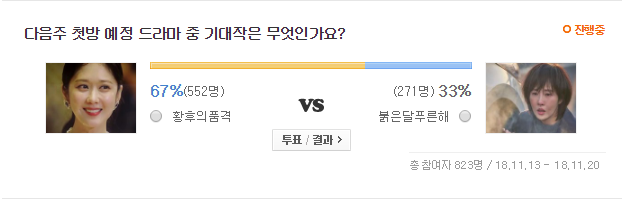 Tiếp đến là lựa chọn: “Bộ phim nào được mong đợi ra mắt vào tuần tới?”. Cuộc bình chọn diễn ra từ 13/11 đến 20/11. Kết quả hiện tại, phim The Last Empress của Jang Nara nhận được nhiều lượt bình chọn hơn với 552 phiếu bầu, chiếm 67%. Trong khi, Red Moon, Blue Sea của Kim Sun Ah mang về 271 phiếu, chiếm 33%.