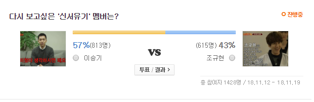 Ở câu thứ thứ, trang web đưa ra câu hỏi: “Bạn muốn nhìn lại thành viên nào của 'Tân tây du ký'?”, được tiến hành từ ngày 12/11 đến 17/11. Theo đó, kết quả cuối cùng ghi nhận rằng có 813 người chọn “chàng rể quốc dân” Lee Seung Gi (57%) và 615 người bầu cho Kyuhyun của Super Junior, chiếm 43%.