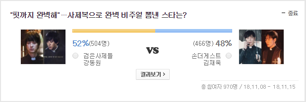 Trong câu hỏi kế tiếp: “Ngôi sao nào đóng vai mục sư có hình ảnh phù hợp, hoàn hảo?”, được tiến hành từ ngày 08/11 đến 15/11. Như vậy, kết quả đã rõ khi Kang Dong Won của phim Mục sư thu về 52% và 504 người bình chọn. Kim Jae Wook của phim The Guest đài OCN được 466 phiếu, chiếm 48%.