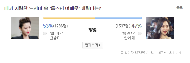 Cuối cùng là sự lựa chọn: “Nhân vật của 'nữ diễn viên hàng đầu' trong bộ phim mà bạn yêu thích là ai?. Như kết quả được công bố, Jeon Song Yi của Vì sao đưa anh tới thắng khi mang về 1736 phiếu bầu, chiếm 53 %. Trong khi Han Se Kye của The Beauty Inside được 1537 người chọn, đạt 47%.