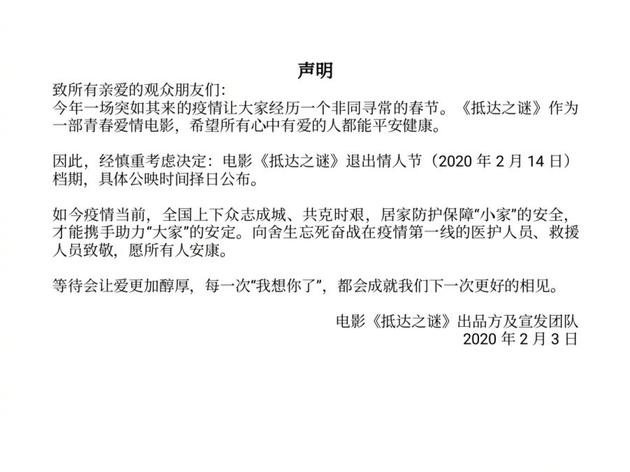 Vì tình hình dịch bệnh hiện giờ nên nhiều phim điện ảnh cũng đưa ra thông báo dời ngày công chiếu phim, tập thể các bộ phim hay nhất trong mùa lễ tết cũng tuyên bố hủy công chiếu. Chính vì vậy, nhiều rạp phim cũng lựa chọn việc tạm dừng kinh doanh vì hiện giờ, an toàn là điều tiên quyết. Với tình hình nguy cấp trước mắt, bộ phim do Lý Hiện đóng chính mang tên Bí mật khi tới (抵达之谜) lúc đầu ấn định vào ngày lễ tình nhân (14/02) công chiếu nhưng nay đã phải đưa ra thông báo hủy bỏ. Phía nhà phim đã đưa ra thông báo như sau: