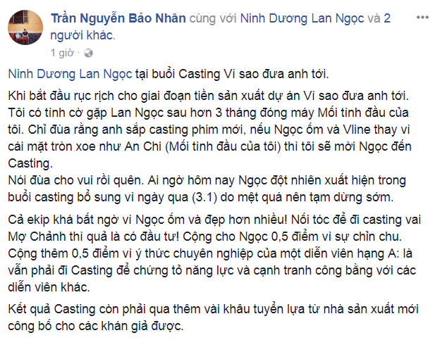 Hình ảnh về Ninh Dương Lan Ngọc trong buổi casting Vì sao đưa anh tới phiên bản Việt được đạo diễn phim chia sẻ trên trang facebook cá nhân của mình.