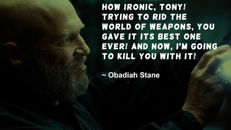 “Mỉa mai quá đi, Tony! Cố gắng xoá sổ vũ khí khỏi thế giới này làm chi, mà rồi ngươi lại tự tay tạo ra một thứ vũ khí tối tân nhất! Giờ đây, ta sẽ dùng chính nó để kết liễu ngươi!”
