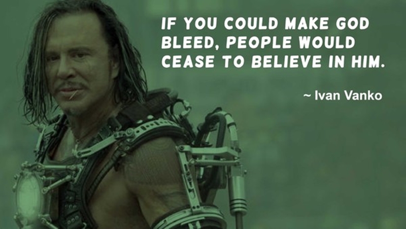 “Nếu ngươi làm Chúa chảy máu, các con chiên sẽ ngưng tin tưởng vào Ngài. Sẽ có máu rơi xuống nước biển, rồi sẽ có cá mập vây quanh. Những gì ta cần làm chỉ là ngồi lại và thưởng thức thế giới này nuốt chửng ngươi.”