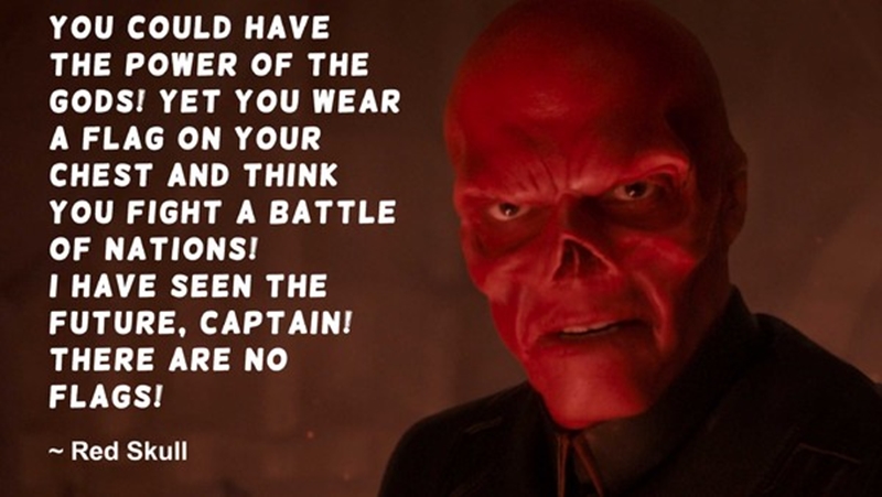 “Ngươi có thể sở hữu siêu năng lực của các Đấng, nhưng rồi ngươi lại mang lá cờ ấy trên ngực, và nghĩ rằng bản thân đang đấu tranh vì quê hương đất nước! Ta đã nhìn thấu được tương lai rồi, hỡi Đội trưởng! Sẽ chẳng còn lá cờ nào nữa đâu.”
