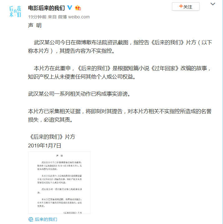 Ngay sau khi tin tức này được đăng tải lên thì weibo chính thức của đoàn phim cũng đã lên tiếng thanh minh cho biết bản thân không hề có bất kỳ hành vi nào làm tổn hại đến lợi ích cũng như quyền lợi của công ty nào dựa trên quyền sở hữu trí tuệ.