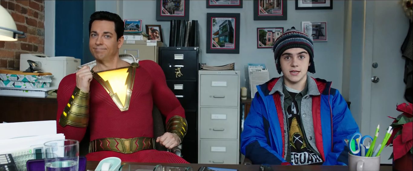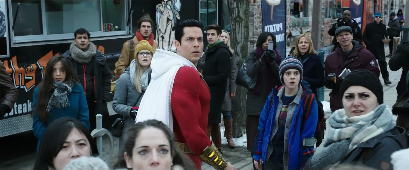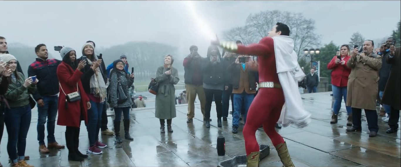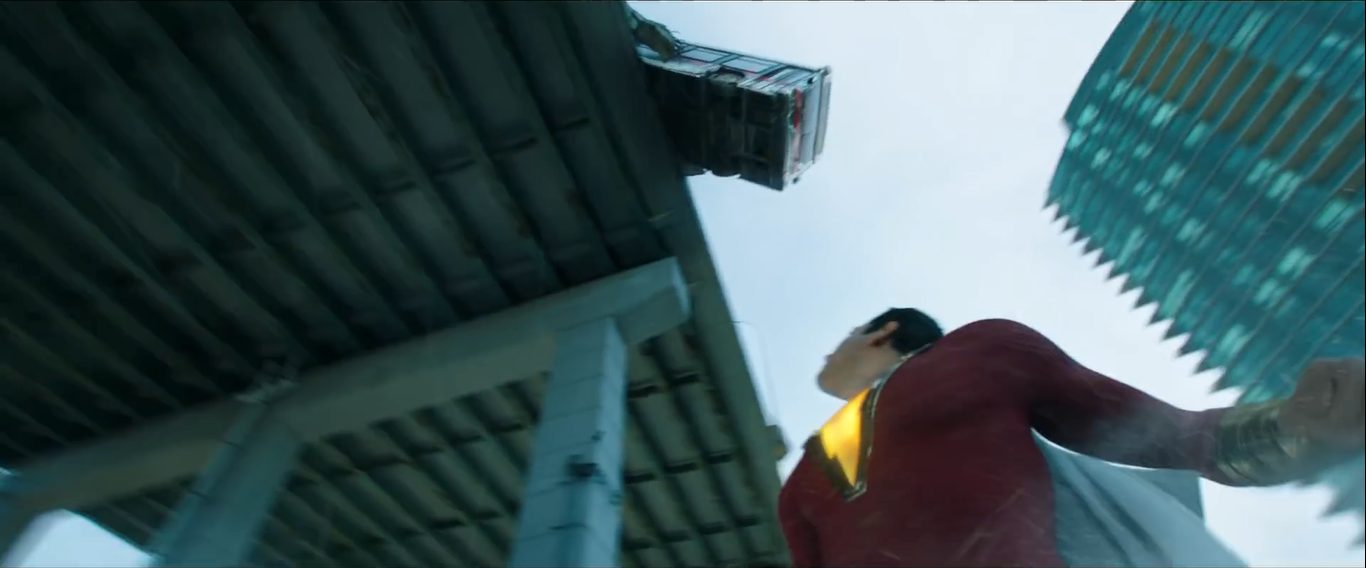 Trong cảnh tiếp theo, Billy Batson nhảy từ nóc một tòa nhà cao tầng xuống và hét “Shazam”, lập tức, một tia sét đánh xuống biến cậu thành siêu anh hùng trong trang phục đỏ-trắng. Với tốc độ nhanh như chớp, Shazam cũng nhanh chóng lao vào con đường hành hiệp trừ gian, tiêu biểu là giải cứu một chiếc xe buýt đầy người sắp rơi khỏi cầu.