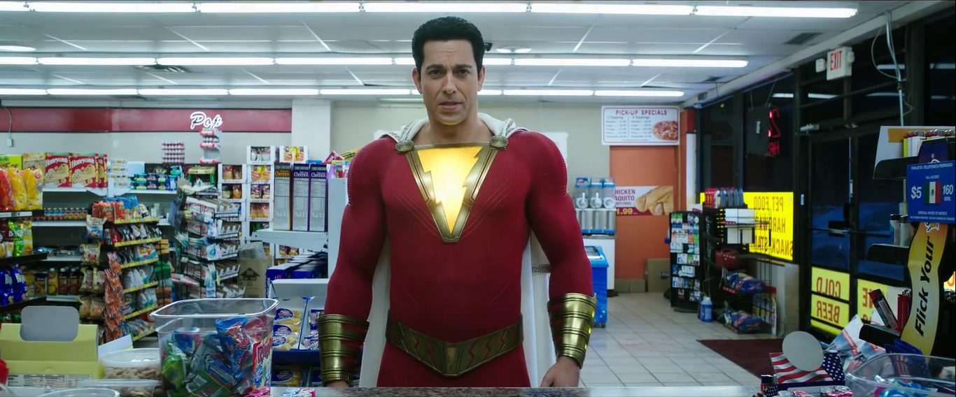 Bên cạnh những cảnh hành động đầy hứa hẹn, thì đúng với tinh thần của bộ phim, Shazam cũng chiêu đãi khán giả với những khoảnh khắc hài hước. Đầu tiên, anh khoác nguyên trang phục siêu anh hùng đỏ-trắng đi vào hàng tạp hóa mua một lốc bia - thứ mà anh vốn không thể mua khi ở trong hình hài Billy Batson.