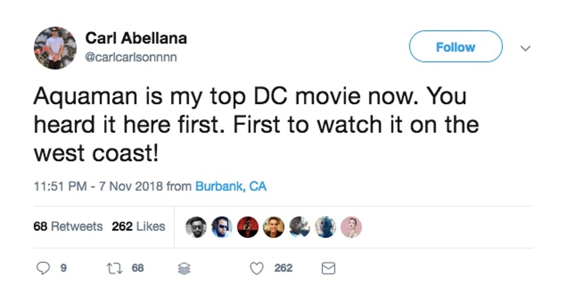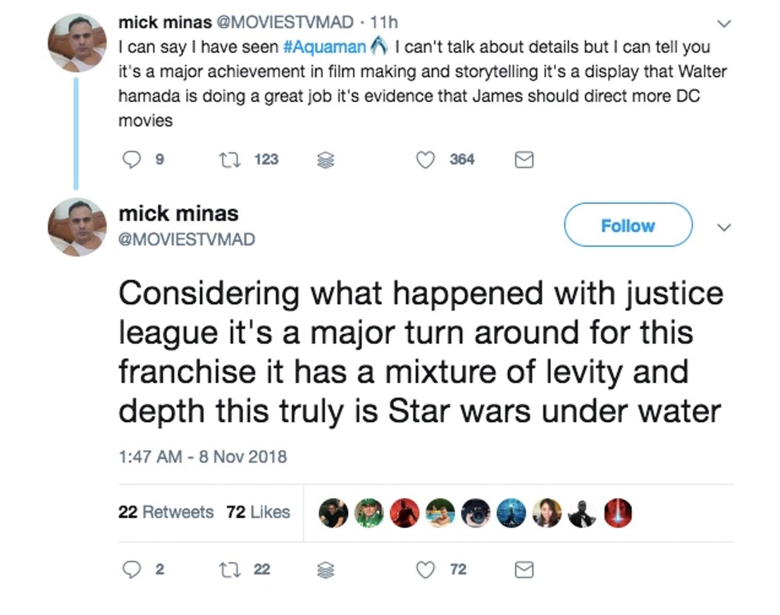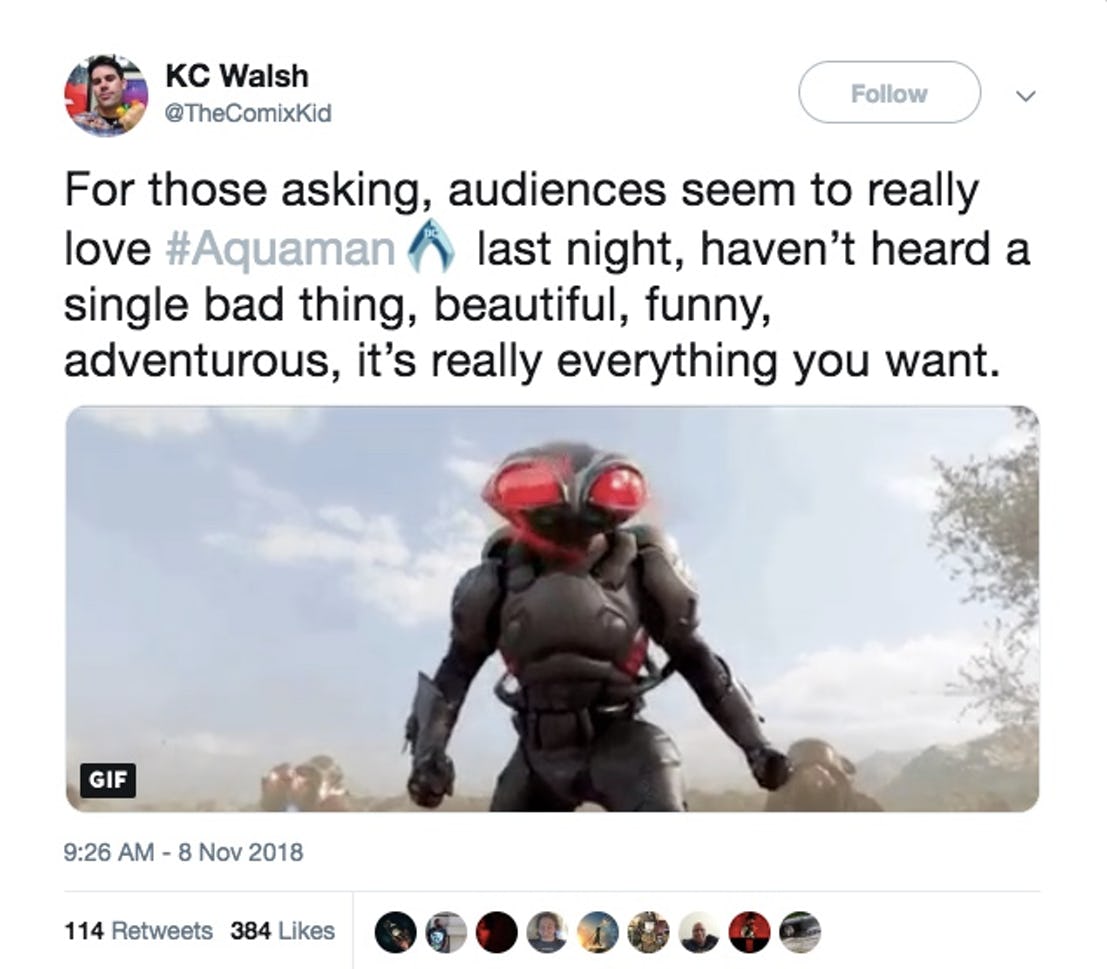 “Khán giả tối qua xem ra rất thích Aquaman. Tôi chưa thấy một phản hồi tiêu cực nào cả. Nó vừa mãn nhãn, hài hước, đầy phiêu lưu mạo hiểm. Tóm lại, chúng ta không thể đòi hỏi gì hơn nữa”