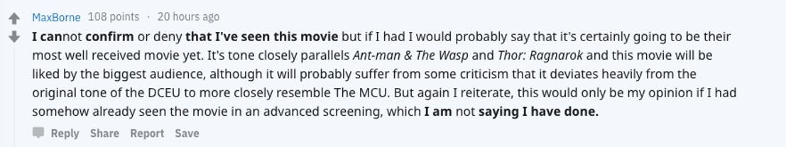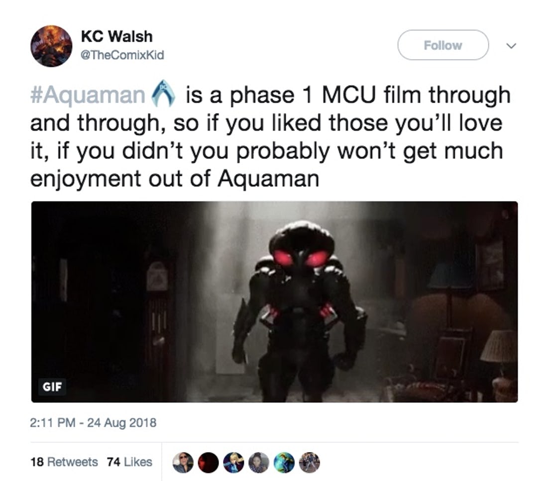 Người xem này cũng so sánh Aquaman với phim siêu anh hùng của đối thủ Marvel, tuy nhiên không phải với các phim đơn giản giai đoạn đầu nữa mà là những bộ phim được đánh giá cao của giai đoạn gần đây, như Ant-Man and the Wasp (2018) và Thor: Ragnarok (2017).