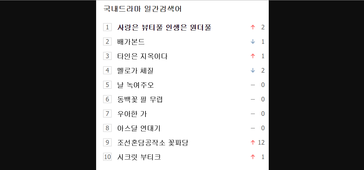 Mới đây, Naver - cổng thông tin hàng đầu và được xem như là Google của Hàn Quốc đã công bố danh sách 10 bộ phim truyền hình Hàn Quốc được tìm kiếm nhiều nhất trong tuần 1 tháng 10, căn cứ vào dữ liệu của ngày 29/09/2019. Việc đứng đầu danh sách tìm kiếm này không có nghĩa là bộ phim đó được xem nhiều nhất, rating mới là điều quan trọng hơn cả. Tuy nhiên việc được tìm kiếm nhiều nhất có nghĩa là bộ phim đó đang nhận được nhiều sự quan tâm và tò mò của công chúng, nó sẽ ảnh hưởng đến rating, khi họ quyết định lựa chọn xem một bộ phim nào đó.