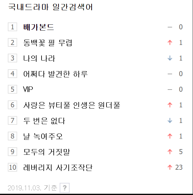Mới đây, Naver - cổng thông tin hàng đầu và được xem như là Google của Hàn Quốc đã công bố danh sách 10 bộ phim truyền hình Hàn Quốc được tìm kiếm nhiều nhất trong tuần 2 tháng 11, căn cứ vào dữ liệu của ngày 03/11/2019. Việc đứng đầu danh sách tìm kiếm này không có nghĩa là bộ phim đó được xem nhiều nhất, rating mới là điều quan trọng hơn cả. Tuy nhiên việc được tìm kiếm nhiều nhất có nghĩa là bộ phim đó đang nhận được nhiều sự quan tâm và tò mò của công chúng, nó sẽ ảnh hưởng đến rating, khi họ quyết định lựa chọn xem một bộ phim nào đó.