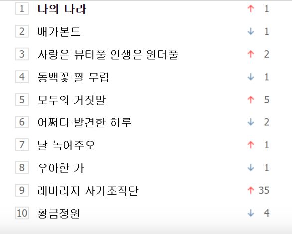 Mới đây, Naver - cổng thông tin hàng đầu và được xem như là Google của Hàn Quốc đã công bố danh sách 10 bộ phim truyền hình Hàn Quốc được tìm kiếm nhiều nhất trong tuần 3 tháng 10, căn cứ vào dữ liệu của ngày 13/10/2019. Việc đứng đầu danh sách tìm kiếm này không có nghĩa là bộ phim đó được xem nhiều nhất, rating mới là điều quan trọng hơn cả. Tuy nhiên việc được tìm kiếm nhiều nhất có nghĩa là bộ phim đó đang nhận được nhiều sự quan tâm và tò mò của công chúng, nó sẽ ảnh hưởng đến rating, khi họ quyết định lựa chọn xem một bộ phim nào đó.