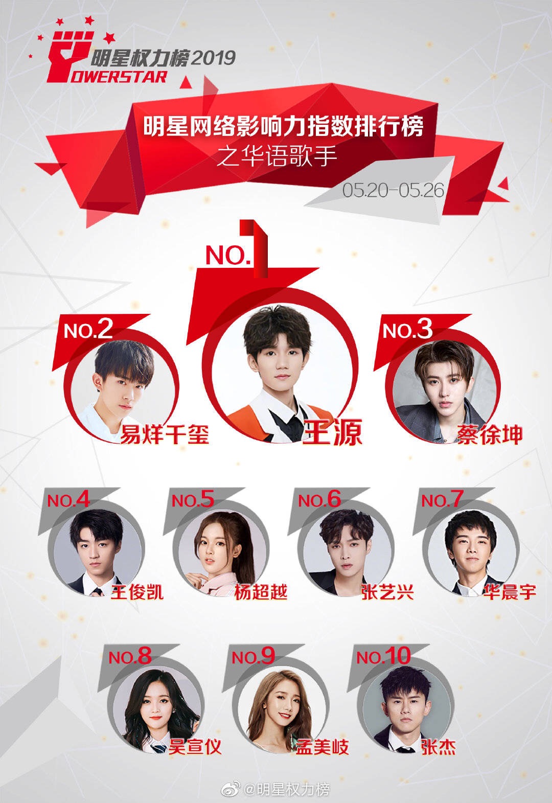 Vương Nguyên vượt lên đứng nhất trong BXH ảnh hưởng hạng mục ca sĩ cuối tháng Năm.