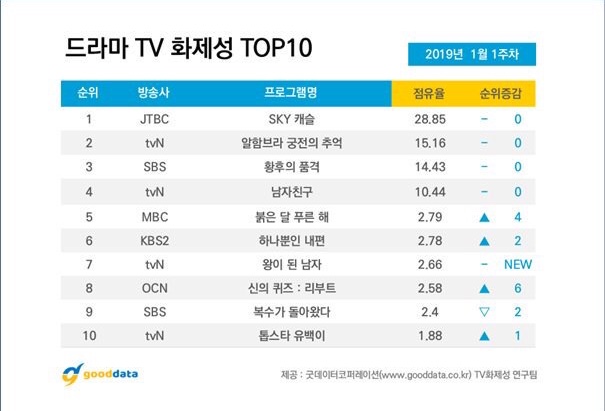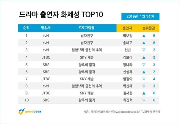 Mới đây, Good Data công bố danh sách xếp hạng các diễn viên và những bộ phim truyền hình đang được trình chiếu ở Hàn Quốc tuần 1, tháng 1 năm 2019. Được biết, kết quả dựa trên sự xem xét, phân tích, đánh giá thông qua các chỉ số tương tác, truyền thông, cộng đồng và số lượng người xem, phản hồi của các bài viết trên mạng xã hội, trên các bài báo, blog của 37 bộ phim. Như vậy, kết quả như sau: