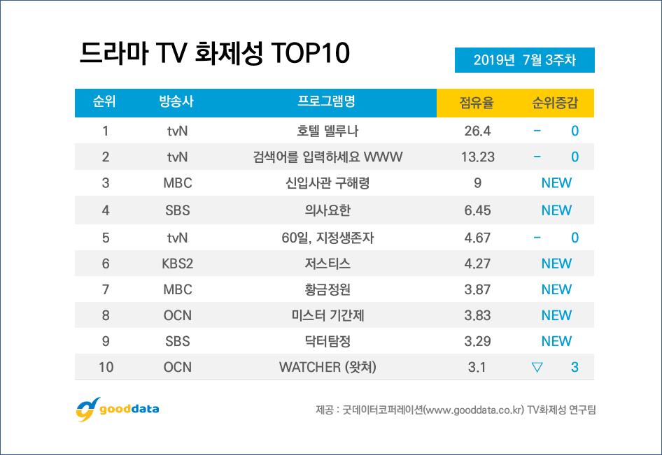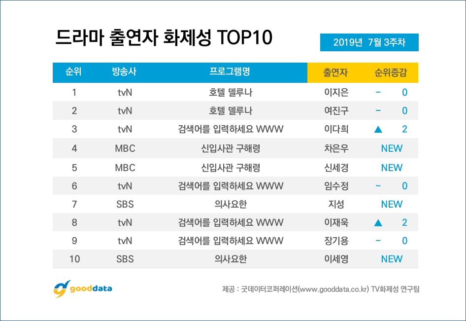 Ngày 23/07, Good Data Corporation đã tiết lộ xếp hạng hàng tuần về những bộ phim truyền hình và diễn viên nổi tiếng nhất tại Hàn Quốc. Kết quả được lấy từ việc phân tích những bộ phim phát sóng hoặc dự kiến phát sóng hiện nay. Dữ liệu lấy từ các bài báo trực tuyến, bài đăng trên blog, diễn đàn cộng đồng, phương tiện truyền thông xã hội và lượt xem trên các video từ ngày 15/07 đến 21/07.