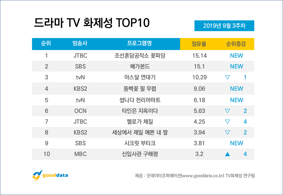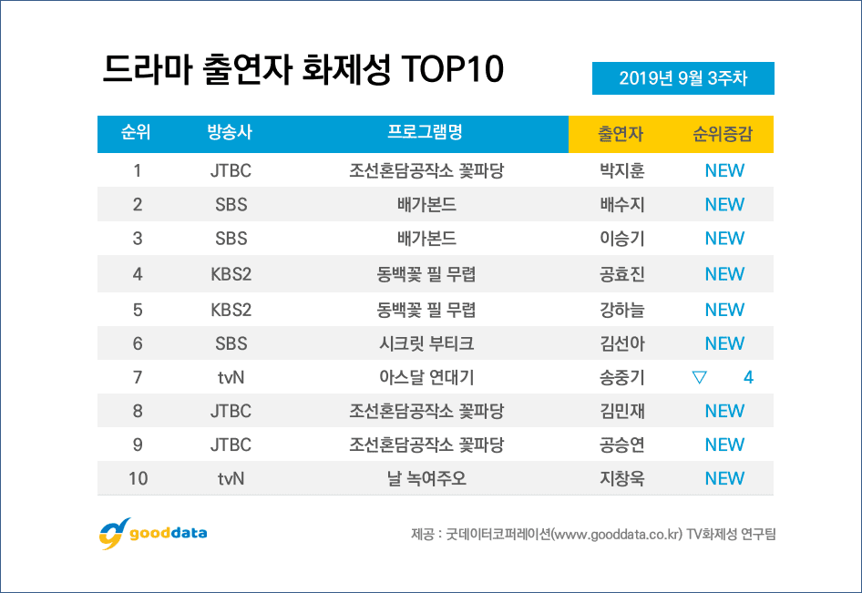 Đứng ở vị trí số 1 trong danh sách những bộ phim truyền hình gây chú ý nhất trong tuần thuộc về drama cổ trang Biệt đội hoa hòe: Trung tâm mai mối Joseon đài JTBC. Khán giả ngợi khen bởi cốt truyện thú vị, phản ứng hóa học tuyệt vời giữa các diễn viên. Trong khi đó, Park Ji Hoon vươn lên hạng 1 trong xếp hạng những diễn viên nổi tiếng nhất. Trong khi, Kim Min Jae và Gong Seung Yeon lần lượt đứng vị trí thứ 8 và 9.