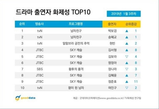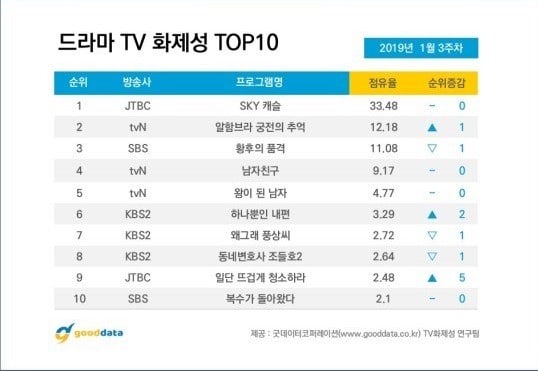 Vào ngày 21/01, Good Data công bố danh sách xếp hạng các diễn viên và những bộ phim truyền hình đang được trình chiếu ở Hàn Quốc tuần 3 tháng 1 năm 2019. Được biết, kết quả dựa trên phân tích, đánh giá thông qua các chỉ số tương tác, truyền thông, cộng đồng và số lượng người xem, phản hồi của các bài viết trên mạng xã hội, trên các bài báo, blog của 34 bộ phim phát sóng từ ngày 14/01 đến ngày 20/1. Như vậy, kết quả như sau: