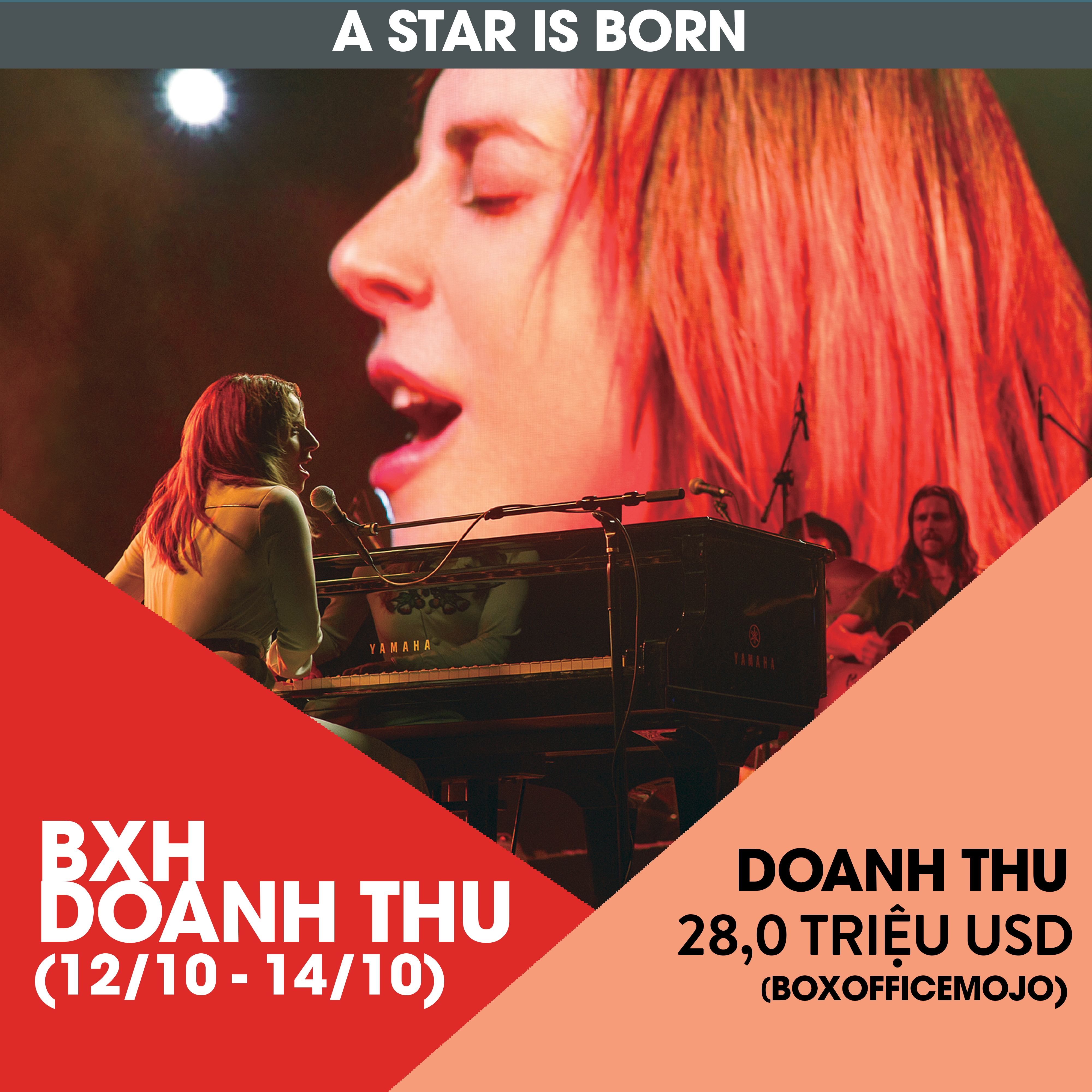 Ở vị trí thứ hai là A Star Is Born với doanh thu trong tuần thứ hai ra rạp là 28 triệu USD - giảm 35% so với tuần mở màn . Hiện tại, tổng doanh thu bộ phim đã thu về tại Bắc Mỹ là 95 triệu đô la sau mười ngày phát hành.