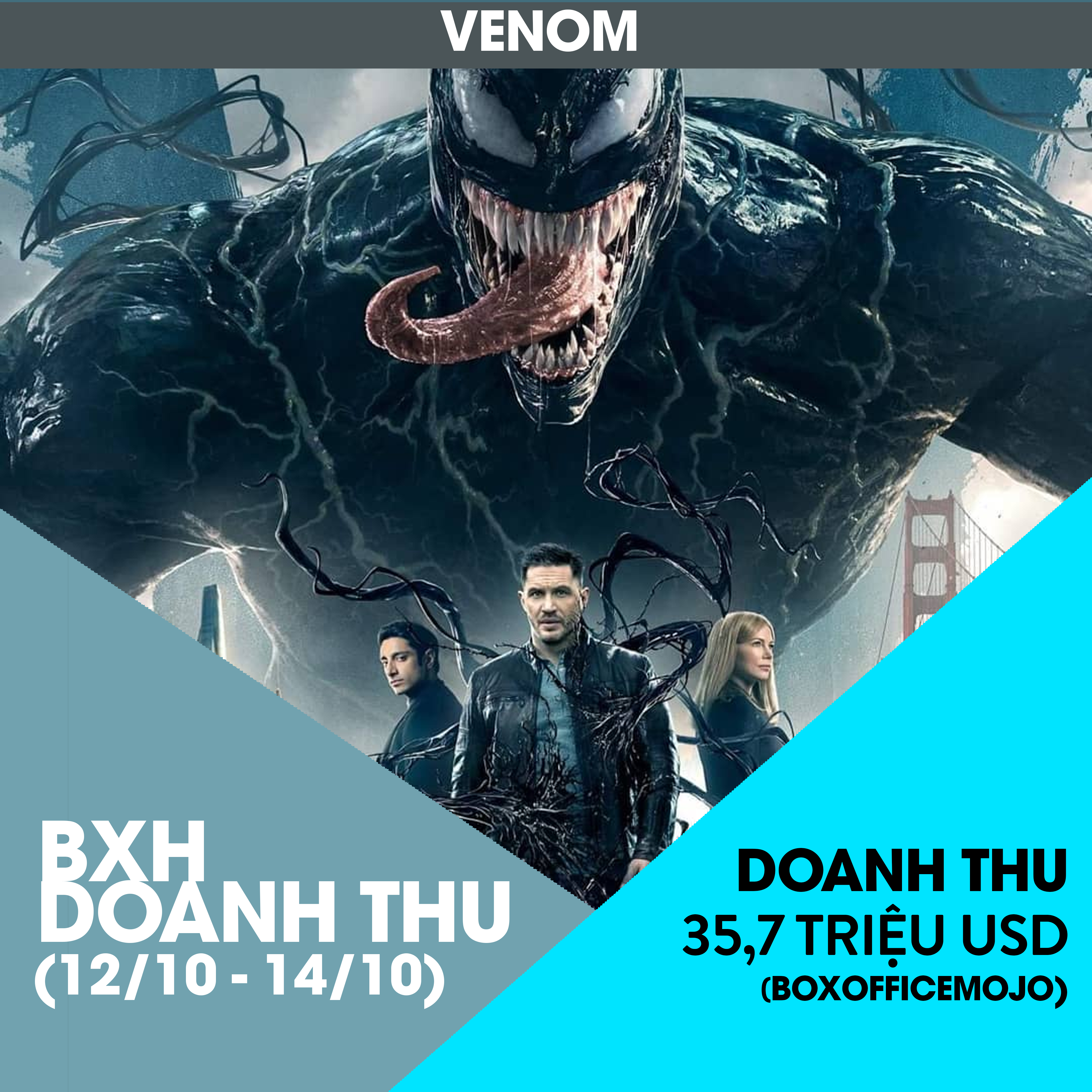 Dù giảm 55% so với tuần mở màn, Venom của Sony vẫn tiếp tục dẫn đầu BXH doanh thu Bắc Mỹ tuần này với doanh thu ước tính là 35,7 triệu USD. Nhờ con số này, tổng doanh thu tại Bắc Mỹ của bộ phim hiện tại đã đạt 143 triệu USD chỉ sau 10 ngày phát hành.