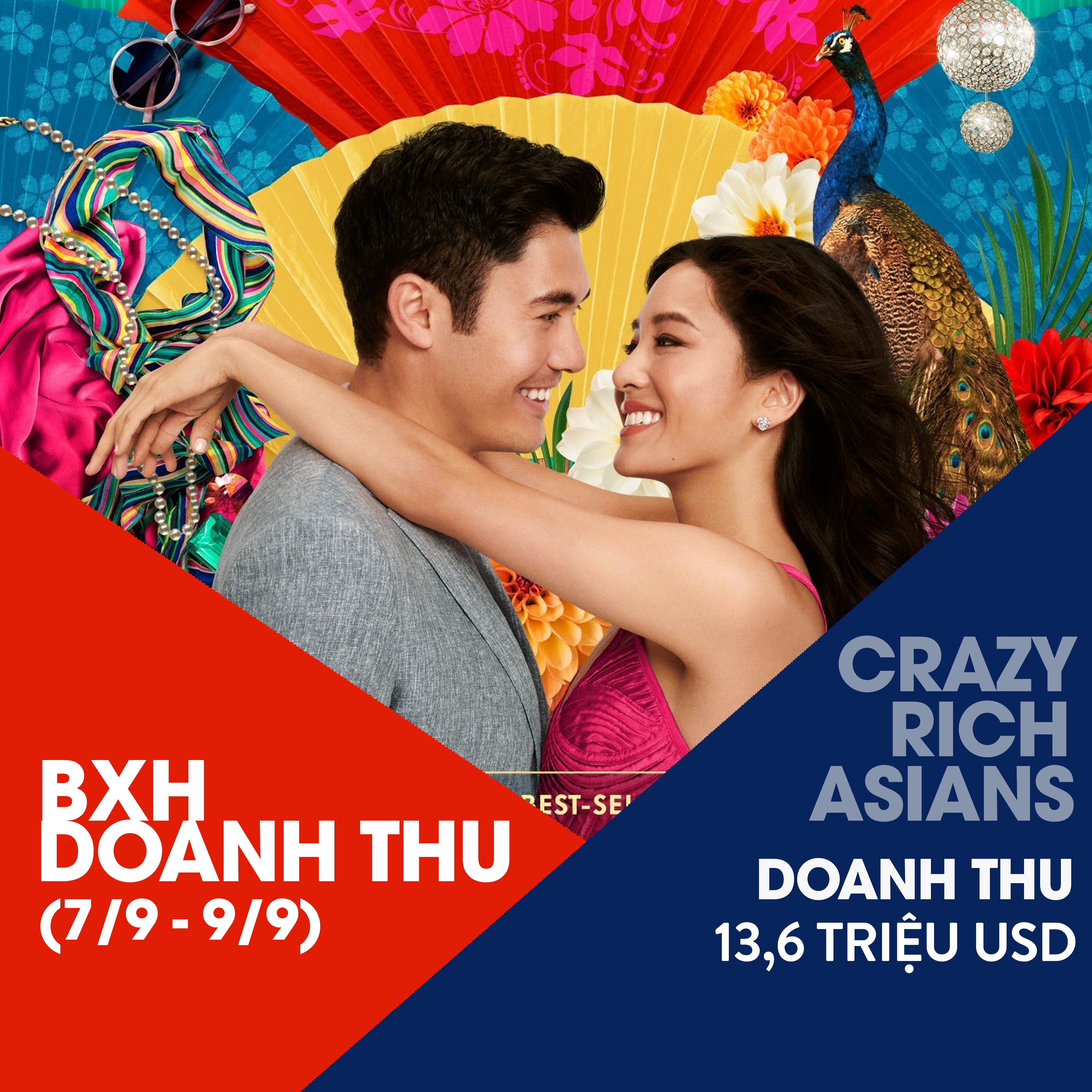 Ở vị trí thứ hai là Crazy Rich Asians với 13,6 triệu USD và nâng tổng doanh thu nội địa của phim lên 136 triệu USD sau 5 tuần ra mắt. Thị trường ngoài Bắc Mỹ, bộ phim cũng đã kiếm thêm được 5,6 triệu USD tại 23 thị trường, giúp doanh thu ở nước ngoài của phim đạt 28,5 triệu USD và doanh thu toàn cầu chỉ nhỉnh hơn một chút so với tuần trước là 165 triệu USD. Bộ phim sẽ được công chiếu tại Anh vào thứ Sáu tới, tiếp theo là các buổi ra mắt tại Mexico (ngày 21 tháng 9) và Nhật Bản (ngày 28 tháng 9).