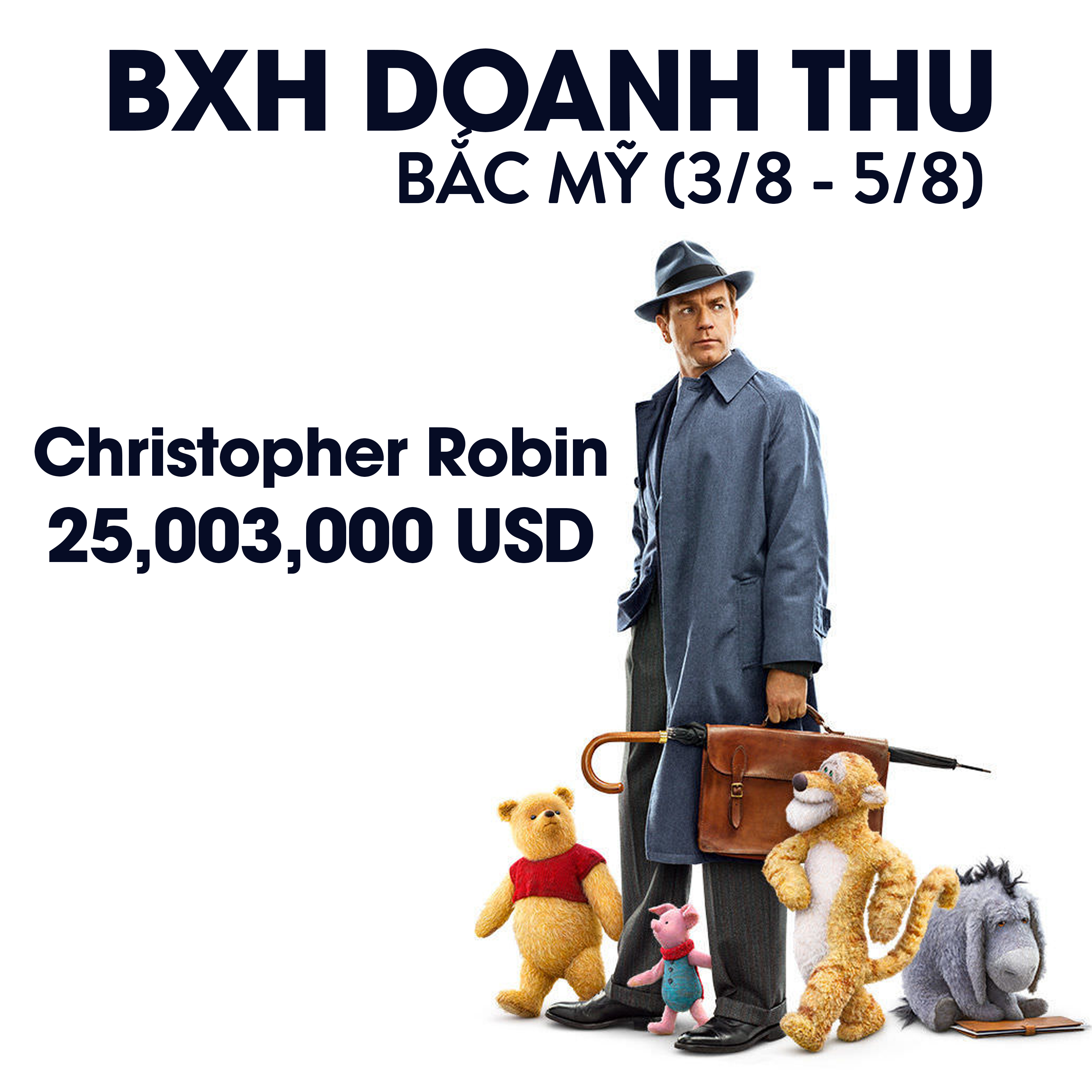 Hạ cánh ở vị trí thứ hai là bộ phim đến từ Disney - Christopher Robin, không đạt được kỳ vọng như dự tính, bộ phim chỉ thu về 25 triệu USD tại Bắc Mỹ. Ở thị trường quốc tế, Christopher Robin đã ra mắt tại 18 thị trường và mang lại doanh thu 4,8 triệu USD, dẫn đầu là Mexico (1,4 triệu USD) và Nga (1,2 triệu USD). Cuối tuần này, bộ phim sẽ ra mắt tại Bỉ, Hà Lan, Iceland, Thái Lan, Ấn Độ, Trinidad và Ecuador và nhà sản xuất hy vọng những thị trường này sẽ cứu vớt doanh thu sau khi bộ phim bị cấm chiếu tại thị trường Trung Quốc.