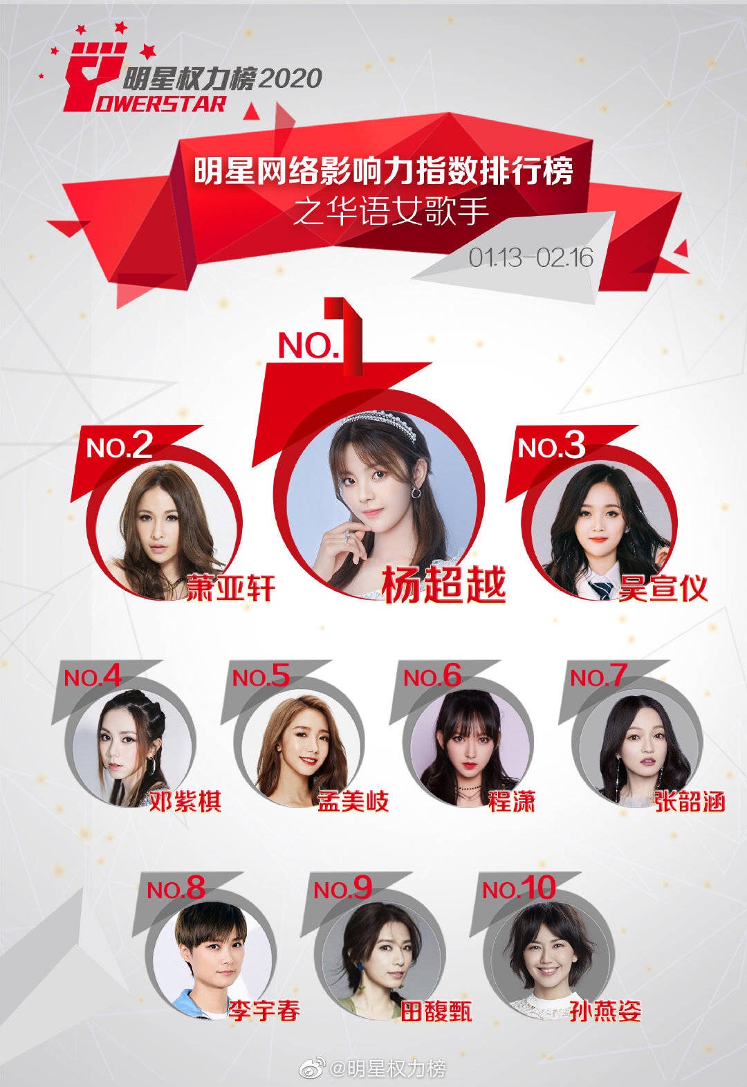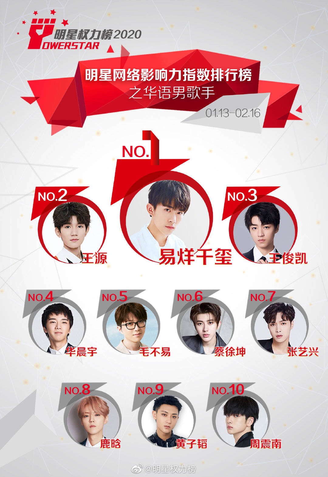 Vừa qua, Powerstar đã công bố xếp hạng cho những ngôi sao châu Á, người sở hữu chỉ số ảnh hưởng lớn nhất đến công chúng từ ngày 23/01 đến ngày 16/02. Kết quả dựa trên thống kê tương tác, bình chọn từ các phiếu bầu của cư dân mạng, người hâm mộ về độ nổi tiếng và sức ảnh hưởng của những nam/nữ ca sĩ trên mạng xã hội Weibo ở Trung Quốc trong một tuần. Theo đó, kết quả như sau: