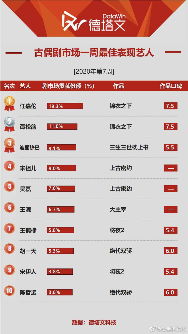 Bảng xếp hạng Nghệ sĩ có biểu hiện xuất sắc nhất trong tuần dòng phim cổ trang thần tượng: