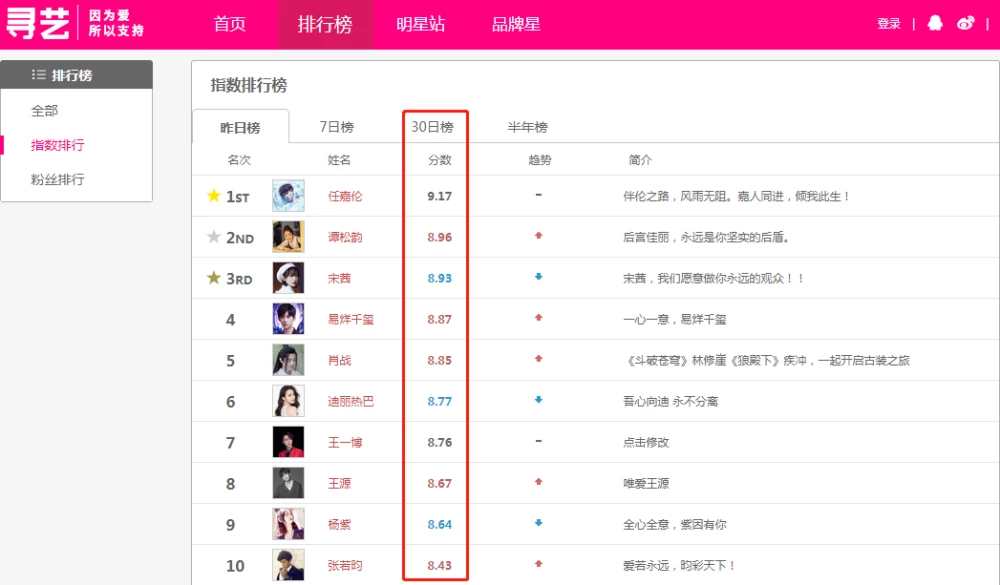 Mới đây, Top 10 bảng xếp hạng chỉ số nghệ sỹ trong thời gian gần đây của trang Tầm Nghệ được đăng tải, Nhậm Gia Luân với chỉ số 9.17 thành công dẫn đầu ngôi vị. Đàm Tùng Vân với chỉ số 8.96 điểm nối tiếp theo sau với vị trí số 2. Tống Thiến với chỉ số 8.93 điểm xếp vị trí thứ 3. Dịch Dương Thiên Tỉ xếp vị trí thứ 4 với chỉ số 8.87 điểm. Tiêu Chiến với chỉ số 8.85 điểm rơi xuống vị trí thứ 5. Địch Lệ Nhiệt Ba xếp vị trí thứ 6 với 8.77 điểm. Vương Nhất Bác với 8.76 điểm xếp vị trí thứ 7. Vương Nguyên xếp vị trí thứ 8 với chỉ số 8.67 điểm. Dương Tử bất ngờ đứng áp chót với chỉ số 8.64 điểm và Trương Nhược Quân với chỉ số 8.43 điểm đứng vị trí cuối bảng.