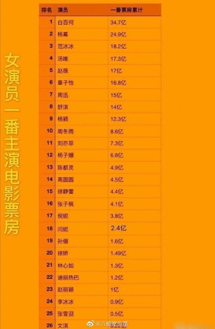 Trong bảng xếp hạng doanh thu phòng vé của các nữ diễn viên phiên một này top 10 minh tinh nữ đứng dầu gồm có Bạch Bách Hà, Dương Mịch, Phạm Băng Băng, Thang Duy, Triệu Vy, Chương Tử Di, Châu Tấn, Thư Kỳ, Angelababy và Châu Đông Vũ.
