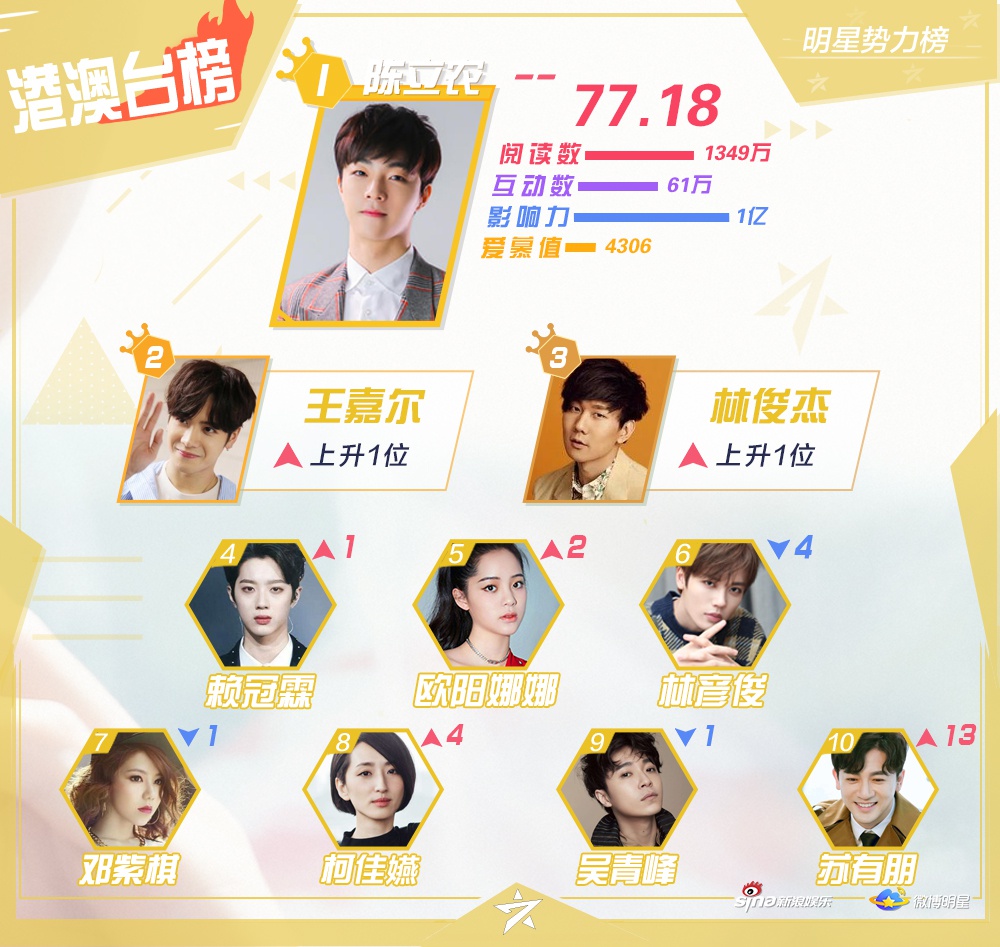 Vừa qua, Sina Entertainment đã công bố Top 10 những nghệ sĩ nổi tiếng, hiện đang hoạt động ở khu vực Đại Lục Trung Quốc, Hong Kong, Macao - Đài Loan, các quốc gia châu Á - Thái Bình Dương, châu Âu - Hoa Kỳ và xếp hạng ngôi sao mới trên mạng xã hội Weibo vào tuần cuối tháng 2.