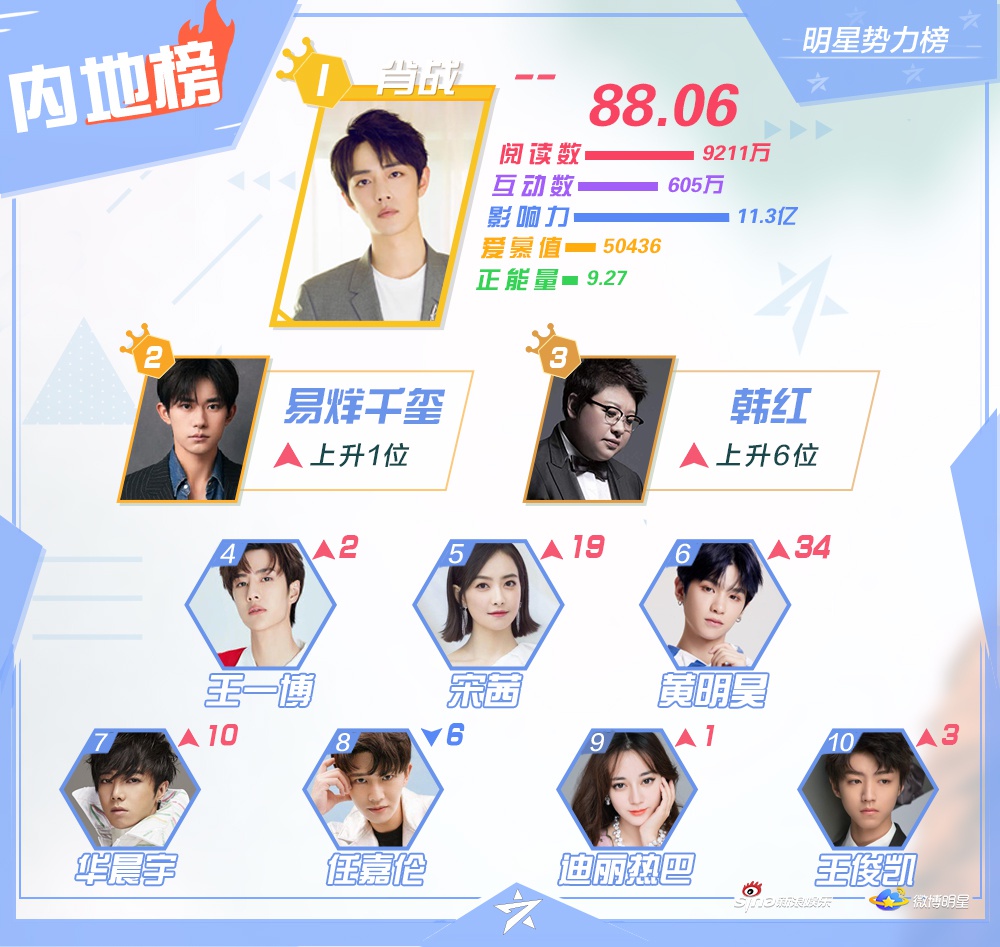 Xếp hạng trong tuần qua có nhiều thay đổi đáng kể. Tuy nhiên, Tiêu Chiến vẫn tiếp tục duy trì vị trí Quán quân ở khu vực Đại Lục trong nhiều tuần liền. Xếp hạng của Dịch Dương Thiên Tỉ và Vương Nhất Bác tăng mạnh. Tuy nhiên, xếp hạng của Nhậm Gia Luân có phần giảm đáng kể. Mặt khác, Tống Thiến thể hiện sức ảnh hưởng lớn sau drama Trạm kế tiếp là hạnh phúc. Trong khi, Tống Uy Long giảm xuống một hạng so với tuần trước ở hạng mục ngôi sao mới.