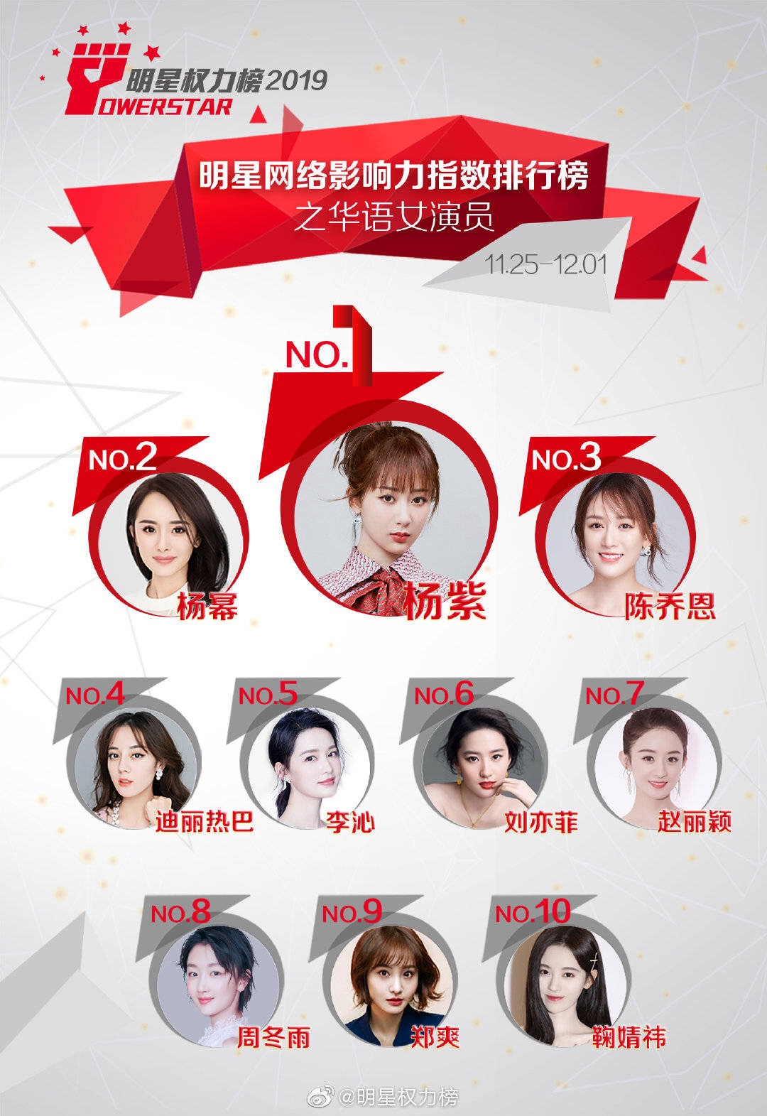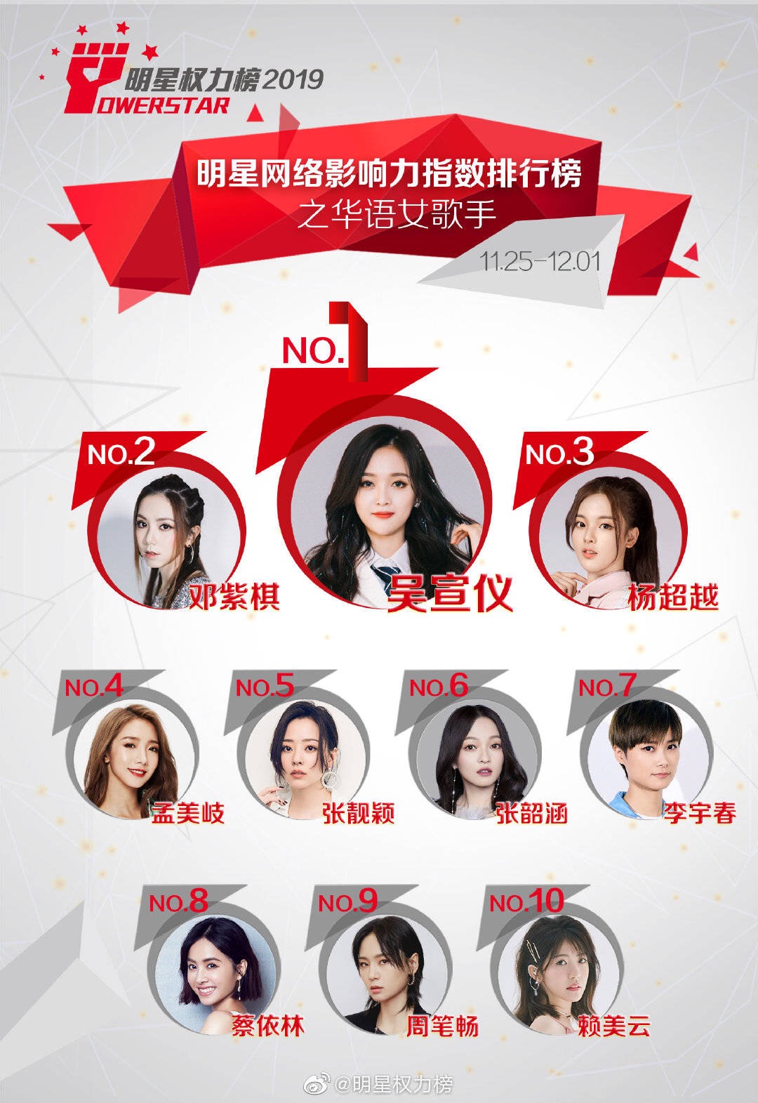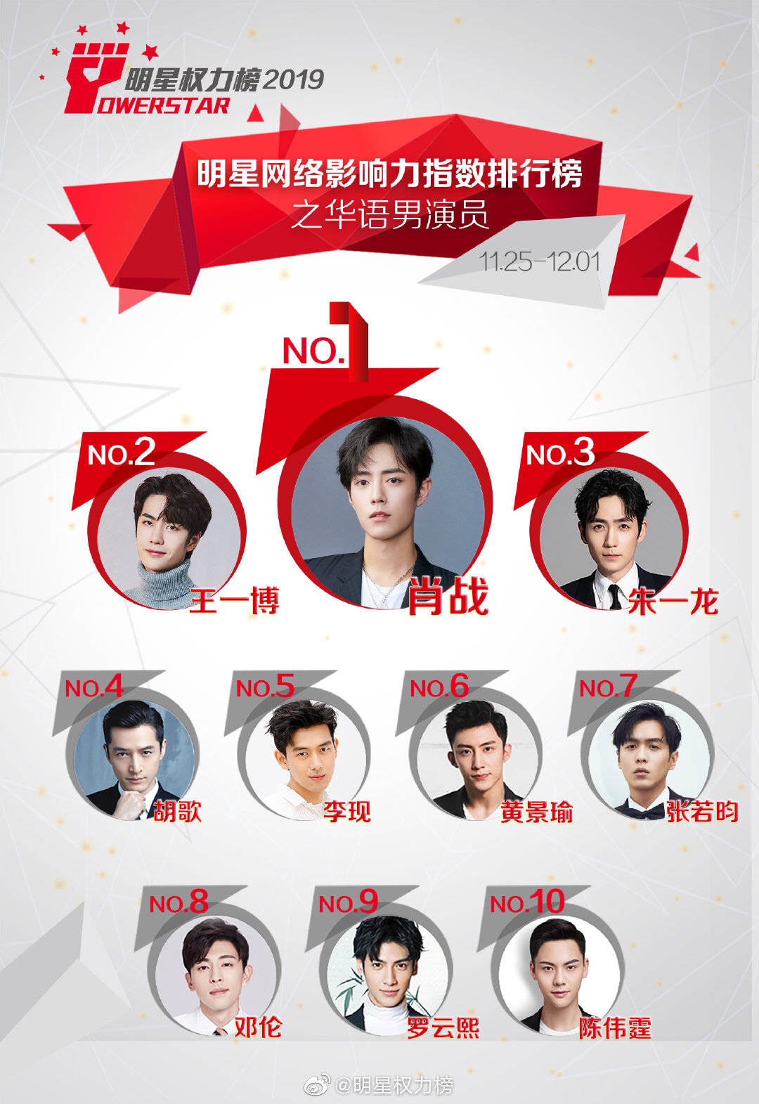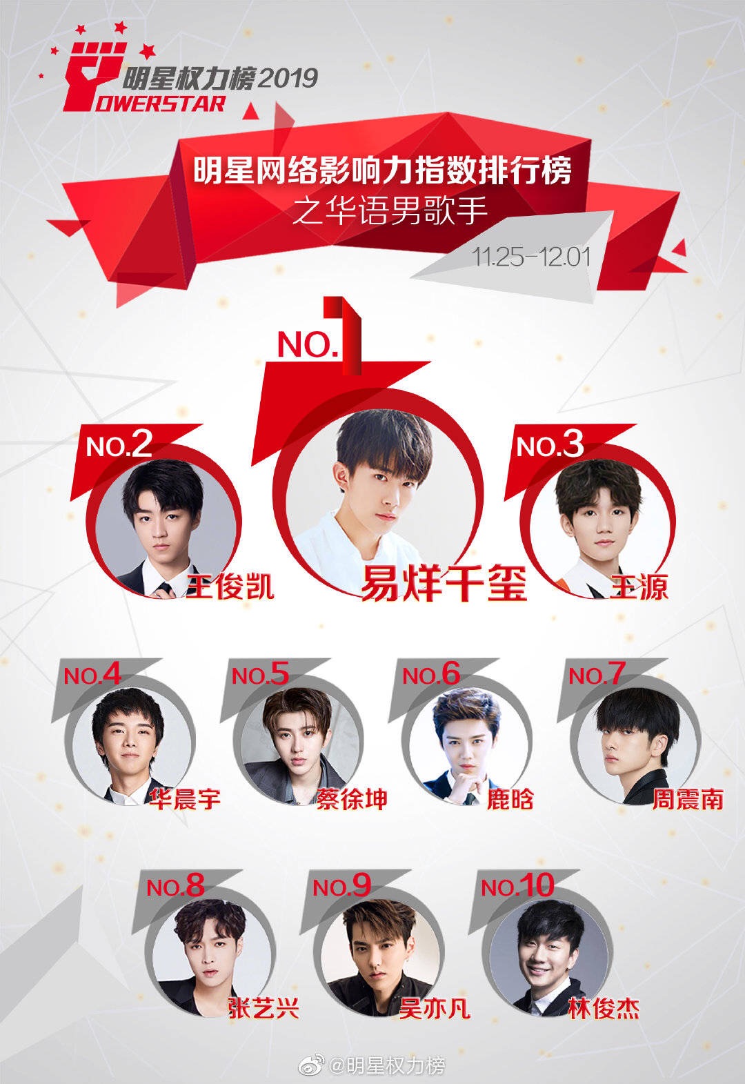 Đến hẹn lại lên, Powerstar đã công bố xếp hạng cho những ngôi sao châu Á, người sở hữu chỉ số ảnh hưởng lớn nhất đến công chúng từ ngày 25/11 đến ngày 01/12. Kết quả dựa trên thống kê tương tác, bình chọn từ các phiếu bầu của cư dân mạng, người hâm mộ về độ nổi tiếng và sức ảnh hưởng của những nam/nữ ca sĩ - diễn viên trên mạng xã hội Weibo ở Trung Quốc trong một tuần. Theo đó, kết quả như sau: