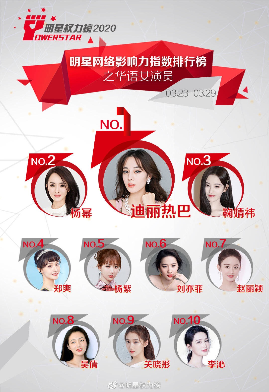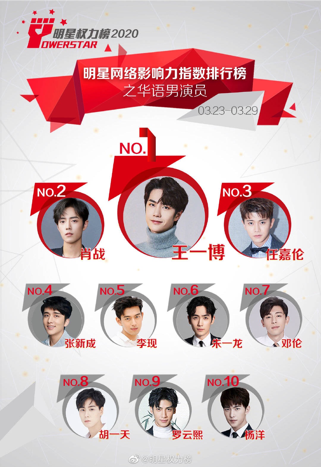 Vào ngày 01/04 vừa qua, Powerstar đã công bố xếp hạng cho những ngôi sao châu Á, người sở hữu chỉ số ảnh hưởng lớn nhất từ ngày 16/03 đến ngày 22/03. Kết quả dựa trên thống kê tương tác, bình chọn từ các phiếu bầu của cư dân mạng, người hâm mộ về độ nổi tiếng và sức ảnh hưởng của những nam/nữ diễn viên trên mạng xã hội Weibo ở Trung Quốc trong một tuần. Theo đó, kết quả như sau: