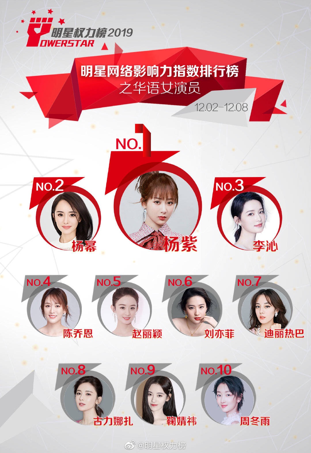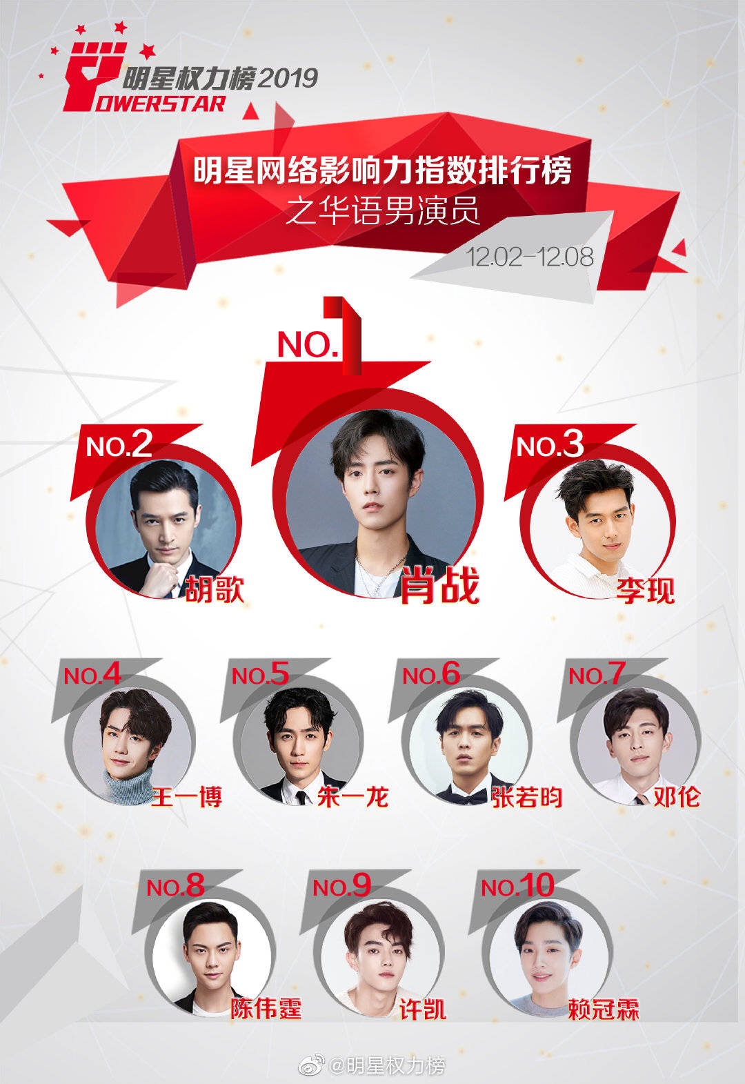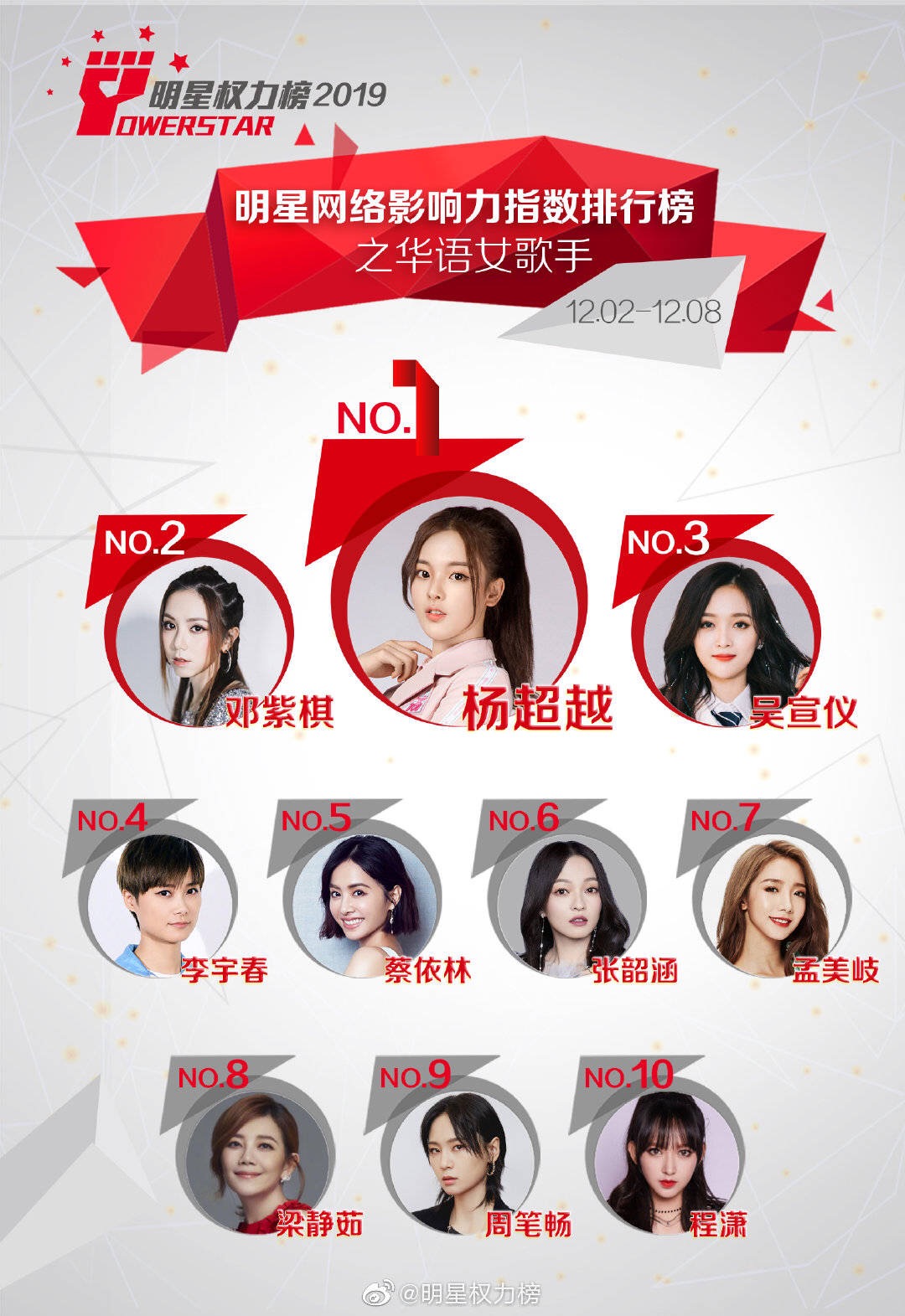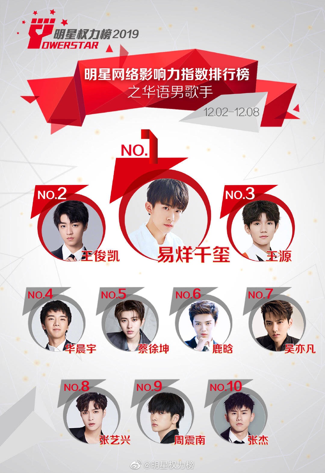Mới đây, Powerstar đã công bố xếp hạng cho những ngôi sao châu Á, người sở hữu chỉ số ảnh hưởng lớn nhất đến công chúng từ ngày 02/12 đến ngày 08/12. Kết quả dựa trên thống kê tương tác, bình chọn từ các phiếu bầu của cư dân mạng, người hâm mộ về độ nổi tiếng và sức ảnh hưởng của những nam/nữ ca sĩ - diễn viên trên mạng xã hội Weibo ở Trung Quốc trong một tuần. Theo đó, kết quả như sau: