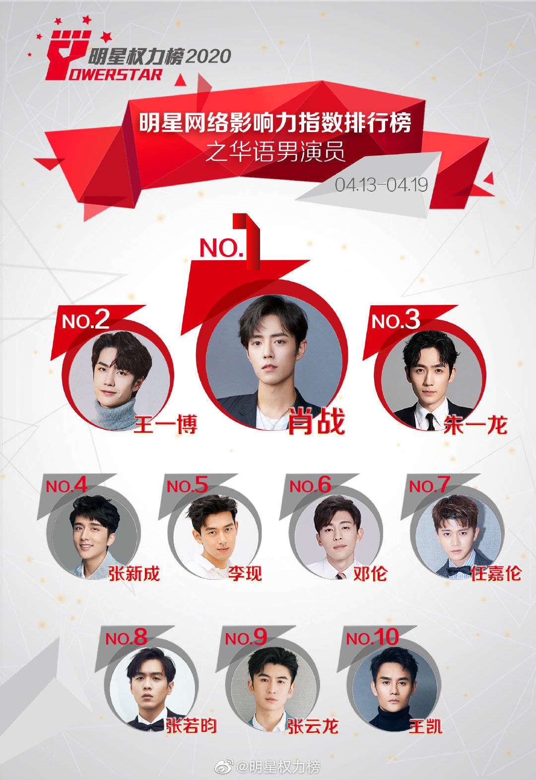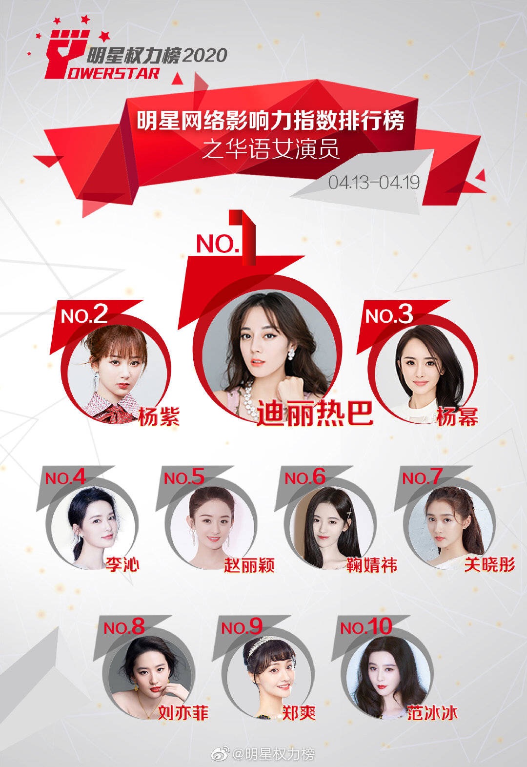 Vào chiều ngày 23/04 vừa qua, Powerstar đã công bố xếp hạng cho những ngôi sao châu Á - người sở hữu chỉ số ảnh hưởng lớn nhất từ ngày 13/04 đến ngày 19/04. Được biết, kết quả này dựa trên thống kê tương tác, bình chọn từ các phiếu bầu của cư dân mạng, người hâm mộ về độ nổi tiếng và sức ảnh hưởng của những nam/nữ diễn viên trên mạng xã hội Weibo ở Trung Quốc trong một tuần. Theo đó, kết quả cuối cùng được cho biết như sau: