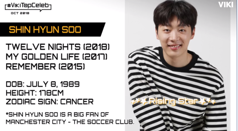 Thay N của VIXX, Shin Hyun Soo trở thành Ngôi sao mới nổi tháng 10 trên Viki Top Celeb. Nam diễn viên hiện đang đảm nhận vai chính trong bộ phim Twelve Nights cùng cựu thành viên KARA - Han Seung Yeon. Trước đó, anh cũng đã xuất hiện trong các tác phẩm như My Golden Life và Remember. Được biết, anh còn là một người hâm mộ lớn của câu lạc bộ bóng đá Manchester City.