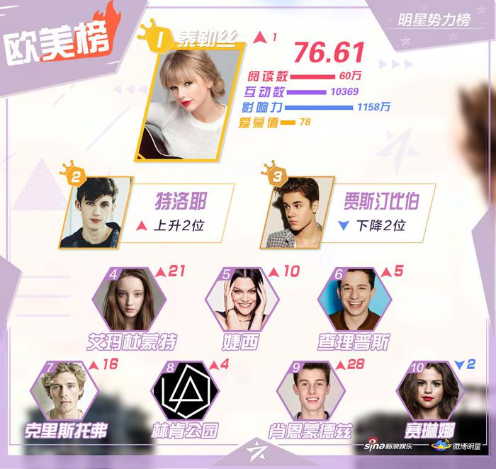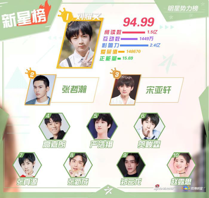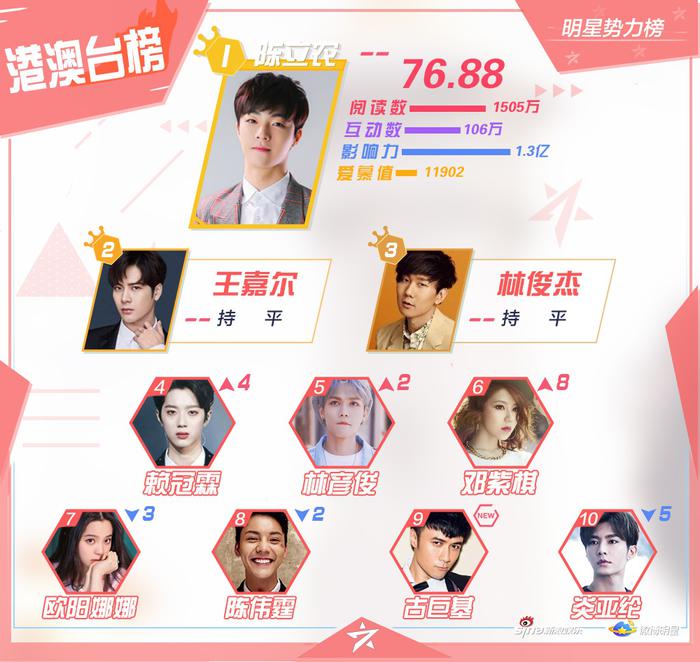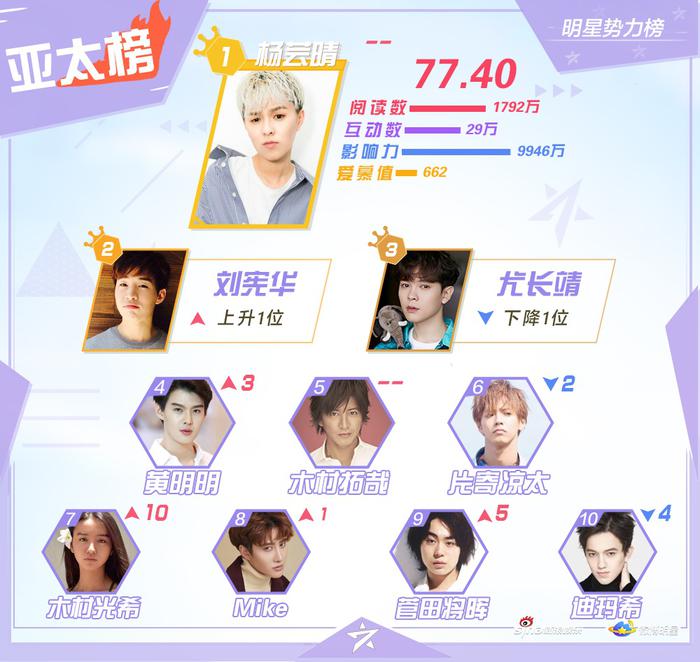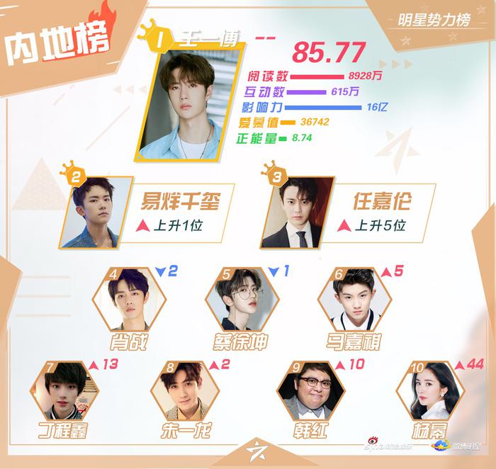 Vừa qua, Sina Entertainment đã tiết lộ 10 những nghệ sĩ nổi tiếng, hiện đang hoạt động ở khu vực Đại Lục Trung Quốc, Hong Kong, Macao - Đài Loan, các quốc gia châu Á - Thái Bình Dương, châu Âu - Hoa Kỳ và xếp hạng ngôi sao mới trên mạng xã hội Weibo vào cuối tháng 3.