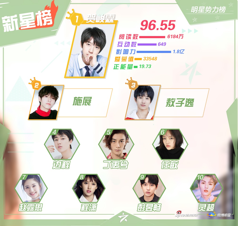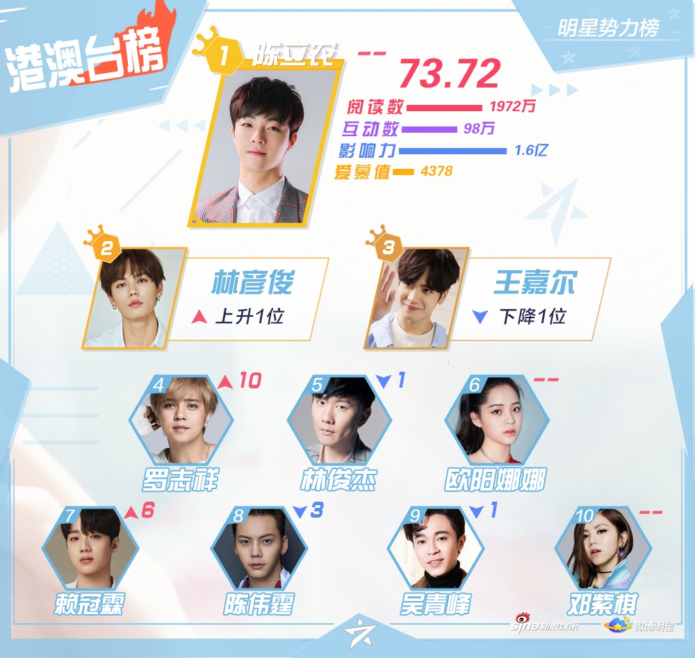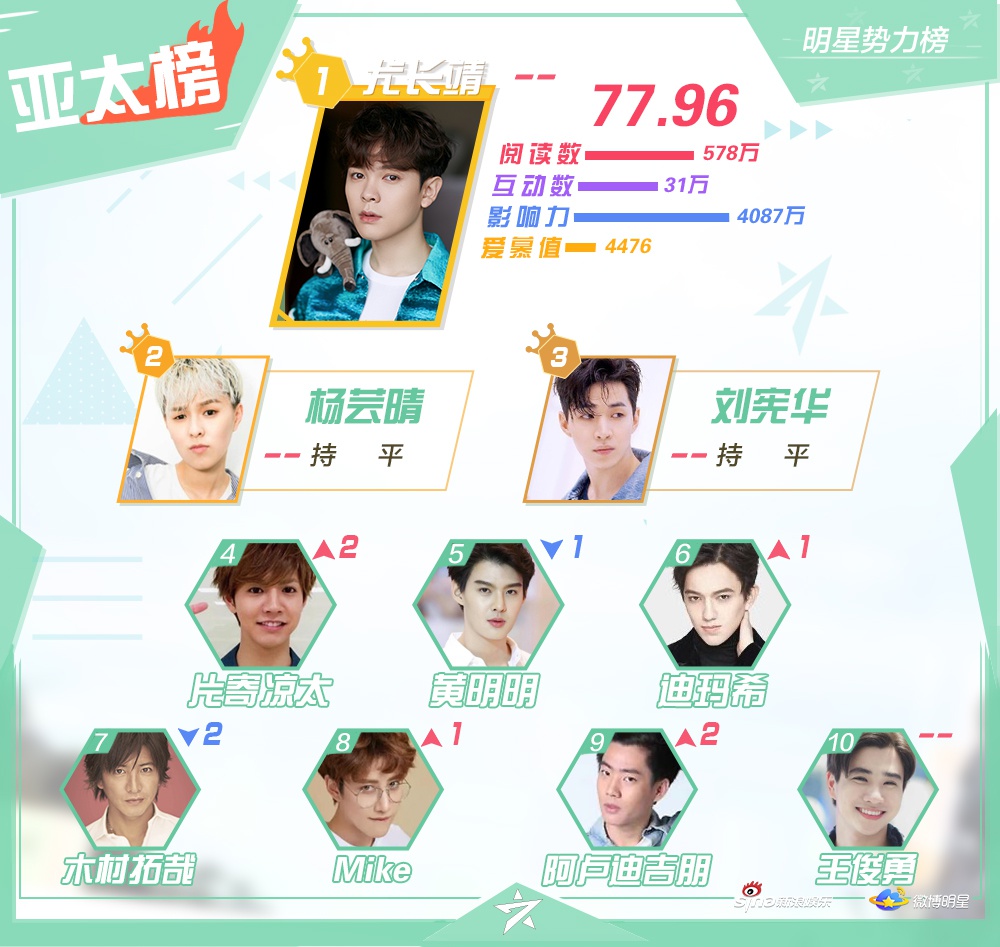 Vào ngày 27/05, Sina Entertainment đã tổng hợp lại kết quả từ việc phân tích các dữ liệu tìm kiếm, lượt tương tác, thống kê về số lượng, ảnh hưởng xã hội và chỉ số giá trị yêu mến từ người hâm mộ của các nghệ sĩ nổi tiếng trong một tuần. Mỗi một chỉ số sẽ được tích lũy và kết quả cuối cùng sẽ được tổng hợp để đưa ra xếp hạng cuối cùng ở từng khu vực.