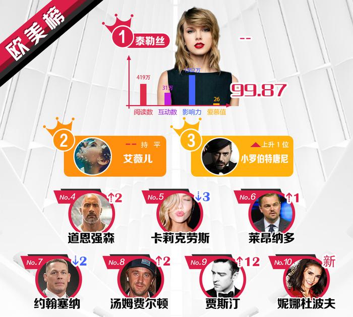 Ba vị trí đầu vẫn được giữ vững lần lượt thuộc về Taylor Swift, Avril Lavigne và Robert Downey Jr. Sau đó 7 hạng còn lại là Dwayne Johnson, Karlie Kloss, Leonardo DiCaprio, Tom Felton, John Cena, Justin Timberlake và Nina Dobrev.
