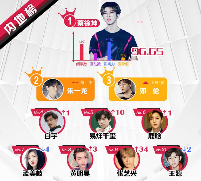 Không khác nhiều so với những tuần trước, Thái Từ Khôn của Nine Percent và “tài tử” Chu Nhất Long vẫn duy trì ngôi vị Quán quân và Á quân. Trong khi, Đặng Luân đẩy Bạch Vũ xuống hạng 4 để leo lên hạng 3. Sau khi rớt hạng và nhường chỗ cho trưởng nhóm Vương Tuấn Khải vào lần trước thì Dịch Dương Thiên Tỉ của TFBOYS vượt 10 đối thủ để lấy lại vị trí thứ 5. Theo đó, những hạng còn lại lần lượt thuộc Lộc Hàm, Mạnh Mỹ Kỳ, Justin (Hoàng Minh Hạo), Trương Nghệ Hưng và Vương Nguyên.
